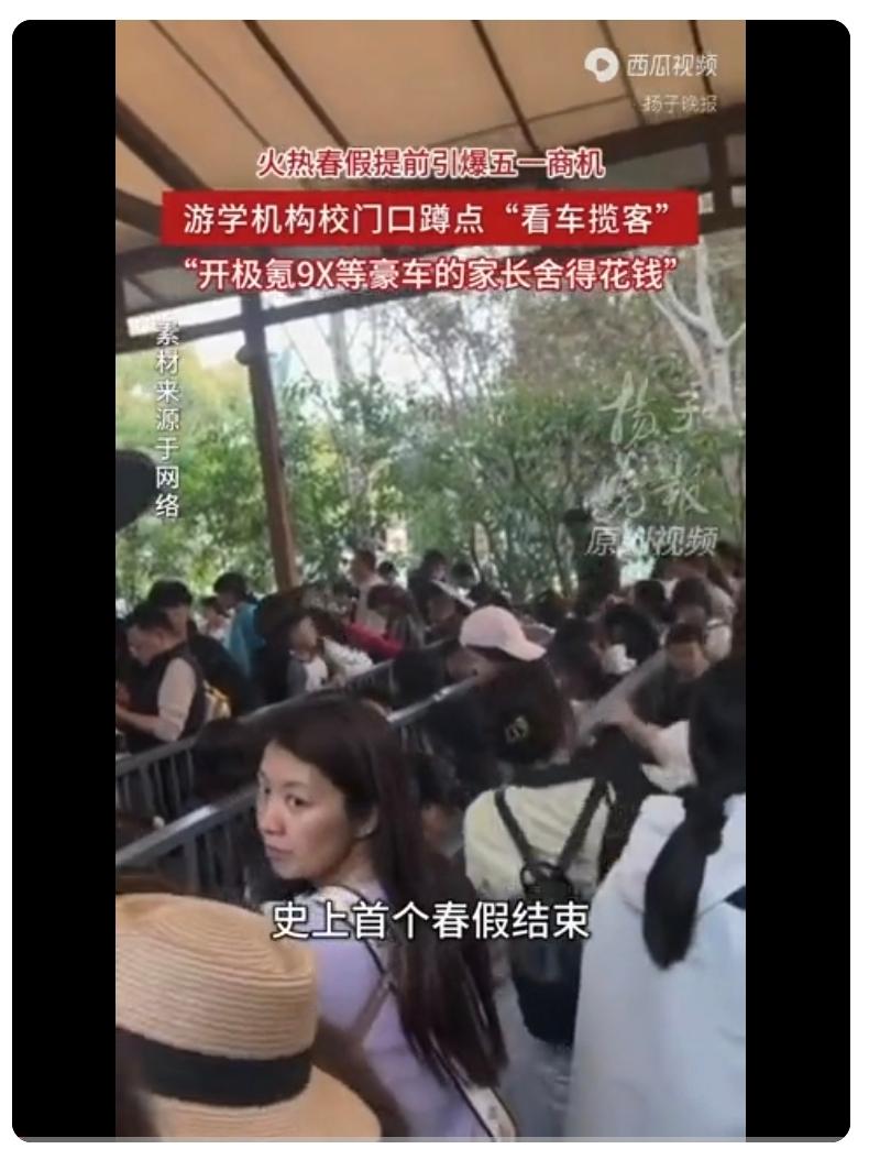 这段话反映了五一假期临近,春假期间的旅游和游学市场需求提前释放,带动相关商机快速升温。具体来看: 火热春假提前引爆五一商机:春假期间,许多家庭开始安排出游或游学活动,带动了旅游、教育培训等相关行业的消费热潮,也提前刺激了五一假期的市场需求。 游学机构校门口蹲点“看车揽客”:一些游学机构为了吸引家长和学生报名,选择在学校门口等学生家长聚集的地方“蹲点”,通过展示豪车等方式吸引注意力,进行现场推广和招生。 “开极氪9X等豪车的家长舍得花钱”:极氪9X作为高端豪华车型,开这种车的U家长通常经济条件较好,更愿意在孩子的教育和游学项目上投入较多资金,游学机构也瞄准了这一高消费群体。 整体来看,这体现了假期经济的提前发力和游学市场的激烈竞争,同时也反映出部分家长对高品质教育和体验式学习的重视。五一放春假 五一出游好处