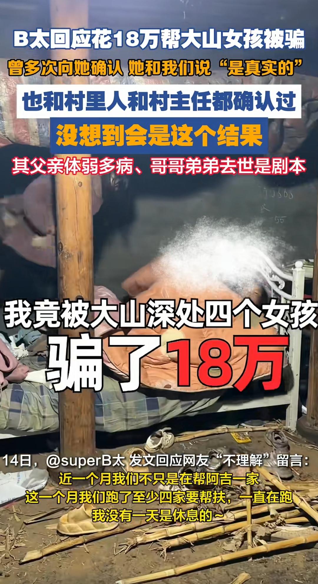 博主B太在四川大山帮扶一个女孩一家,结果被骗18万! 其父亲体弱多病,哥哥弟弟去世都是剧本,其实家庭状况非常的好,这个女孩还用得起苹果手机呢。 已知的三个网红,b太,澳门老炮,阿磊在路上都曾帮助过,惯犯了家里好几个房子,演技秒杀好莱坞! 救急不救穷,18万元可以购买近2000套书包文具,帮助更多贫困地区的儿童。 各位是怎么看的?欢迎评论区留言。