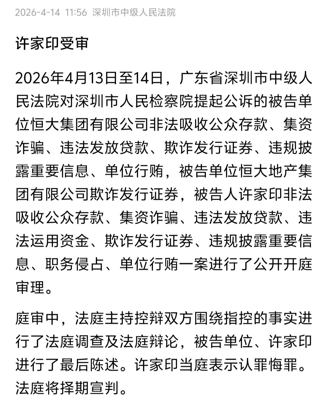 这个实业报国,必要时候可以把一切捐给国家的男人,可能做到了。 说白了,曾经高喊"实业报国、一切捐给国家"的许家印,如今站在被告席上面临八项重罪指控,这场惊天反转,不是个人悲剧,而是资本失控、信仰崩塌、底线尽失的典型标本,更是给所有企业家敲响的最沉重警钟。 然而,庭审列出的罪名清单,每一条都像一把尖刀,撕碎了他往日的所有光环。非法吸收公众存款、集资诈骗、违法发放贷款、欺诈发行证券、违规披露重要信息、职务侵占、单位行贿,这八项罪名覆盖金融、证券、公司治理全领域,普通人沾上一项便足以身败名裂,而他却集于一身,堪称经济犯罪的"集大成者"。 更关键的是,这些罪名背后,是触目惊心的犯罪事实。2019至2020年,恒大系统性财务造假,两年虚增收入超5600亿元,占当期营收一半以上,靠虚假数据发行208亿元债券,明目张胆欺骗资本市场。恒大财富非法募资超400亿元,让无数普通人毕生积蓄化为乌有。 殊不知,许家印早已布下精密的"财富防火墙"。危机爆发前,他在美国设立23亿美元家族信托,将资产转移至离岸账户;通过离婚"技术性切割",试图保全家族财富。十多年间,他与家族从恒大套现分红超500亿元,却把2.4万亿债务、烂尾楼盘留给社会与民众。 同时,这场灾难的代价正由全民默默承担。全国1300个楼盘烂尾,72万套房屋无法交付,数百万家庭钱房两空,一边还房贷一边无房可住。超10万家供应商被拖欠货款,上万家中小企业破产,超百万工人失业,上下游产业链近乎崩塌。 可问题在于,许家印并非不懂法、不知情。他长期以"爱国企业家"自居,多次公开宣称"恒大的一切都是党和国家给的",高调投身慈善、扶贫,累计捐款超百亿,多次获评"中国首善"。这种人前高调爱国、人后疯狂敛财的双面做派,极具欺骗性与讽刺性。 尤有甚者,他的行为早已突破商业道德底线,演变为有组织、有预谋的系统性犯罪。从财务造假、欺诈发债,到非法集资、违规放贷,再到转移资产、行贿庇护,形成完整的"犯罪闭环"。他把恒大变成个人提款机,把法律当摆设,把民众血汗钱当成掠夺对象。 深一层看,许家印案暴露的不只是个人问题,更是资本无序扩张的深层隐患。部分企业家在成功后迷失自我,把政策红利当成个人能力,把社会信任当成敛财工具,把企业帝国当成私人领地,最终在欲望中迷失,从时代宠儿沦为阶下囚。 说到底,许家印的结局是必然的。"实业报国"从来不是挂在嘴边的口号,而是守底线、知敬畏、担责任的实际行动。当信仰让位于贪婪,当责任让位于私欲,当法律让位于狂妄,再辉煌的商业帝国也会瞬间崩塌,再完美的人设也会彻底粉碎。 以上是小编个人看法,如果您也认同,麻烦点赞支持!有更好的见解也欢迎在评论区留言,方便大家一同探讨。