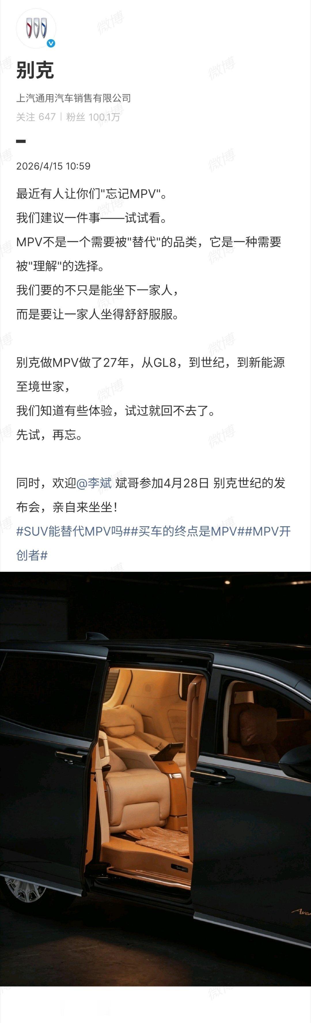 比如别克就主动回应,并且邀请斌哥来参加4月28日别克世纪发布会。别克的观点也很直接,MPV就是一个独有品类,它是无法被替代的。