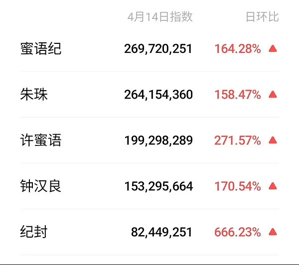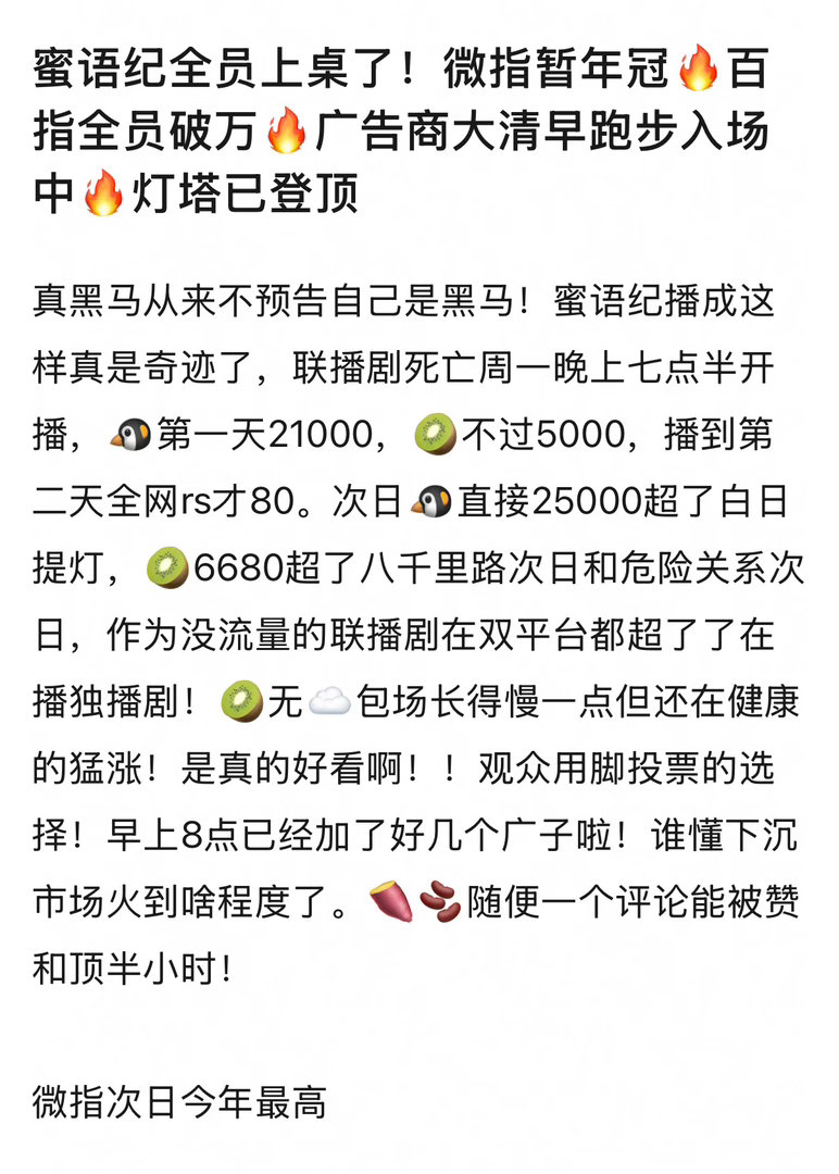 朋友们,《蜜语纪》好像真的有要爆的趋势,剧集微指破2亿,朱珠微指也破2亿,其他几个主要角色包括李梦经超微指也都六七千万了