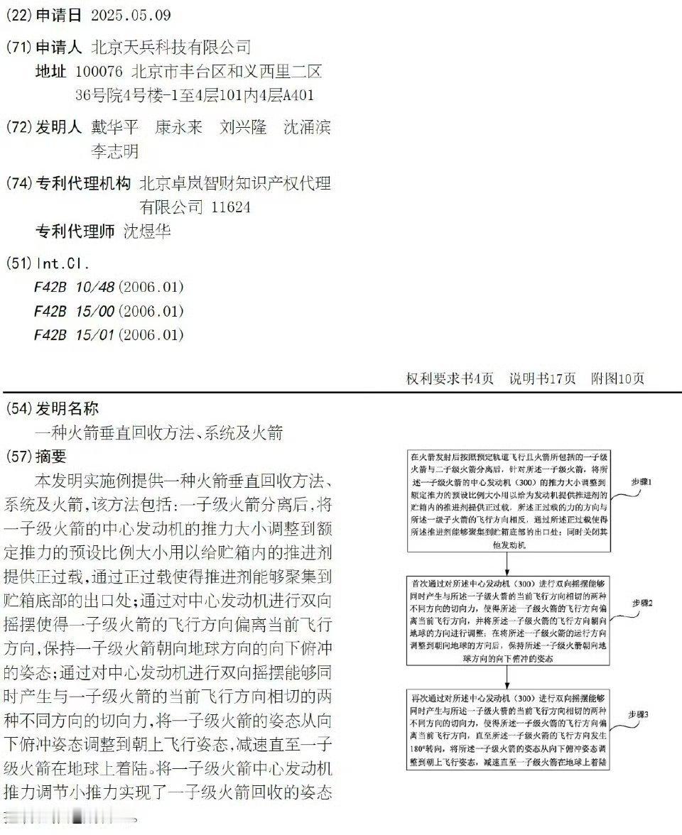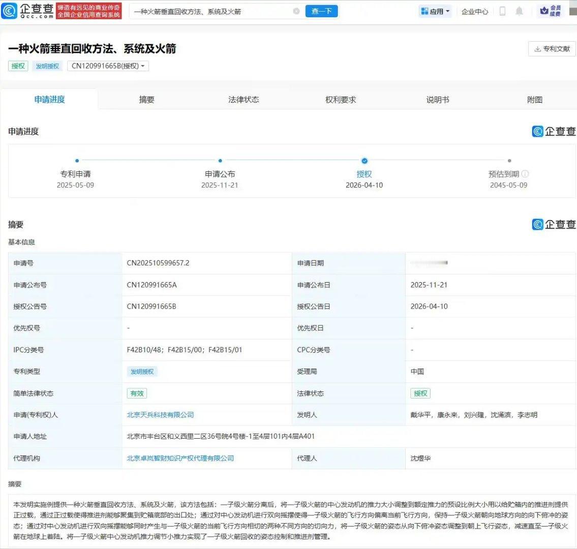 北京天兵科技申请的《一种火箭垂直回收方法、系统及火箭》专利获授权