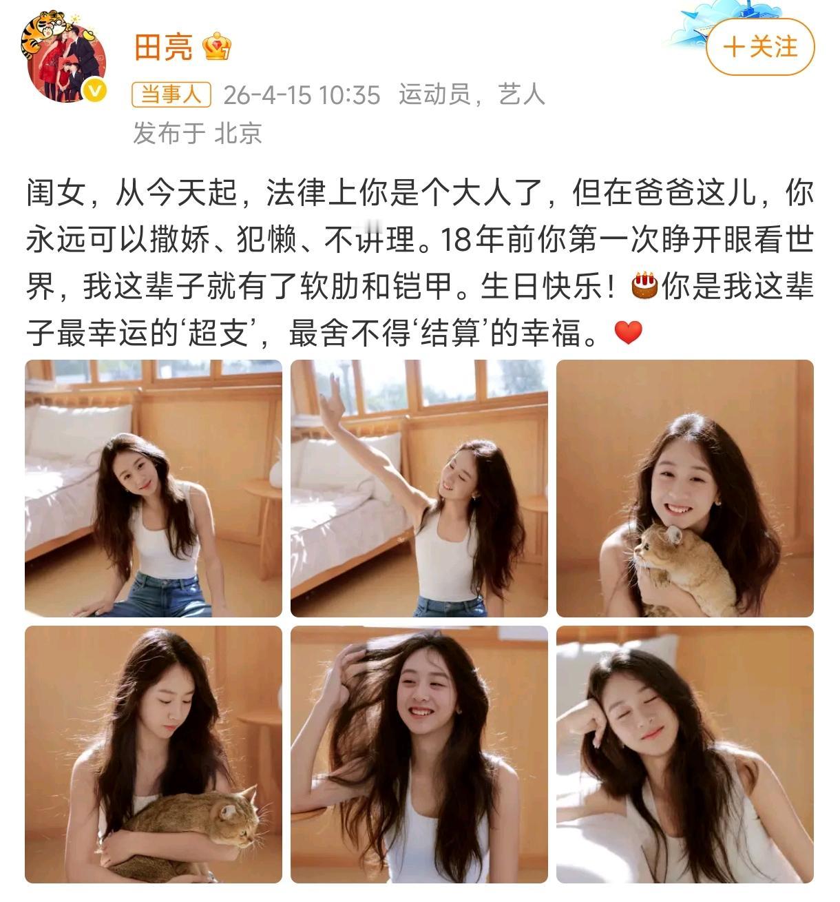 森碟18岁!风一样的女子长成高挑元气少女。 4月15日,田亮叶一茜女儿田雨橙(森碟)迎来18岁生日,父母微博晒暖心祝福与生日写真,全网热议其成年蜕变 。 当年《爸爸去哪儿》里,那个扎双马尾、跑起来像阵风的小萌娃,如今长成身高高挑的元气少女。 写真里,她穿白背心配牛仔裤,长发蓬松,眉眼舒展,戴生日帽软萌,抱粉色气球温柔,满是青春感。 网友感叹女大十八变,颜值惊艳。对比部分星二代,森碟不恋镜头,专注网球与成长,父母低调守护。 18岁是新起点,她没被童星光环困住,走自己的路。成年不是终点,是奔赴热爱的开始,未来可期。