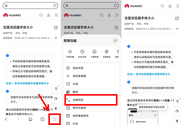 阅读小说、长文档时,网页顶部的地址栏和底部的工具栏等界面元素易挤占视野。点击右下角 “∷” 即可开启华为浏览器的「全屏浏览」功能,让内容全屏展示;使用系统返回即可快速恢复操作栏,兼顾沉浸体验与便捷操作,充分利用屏幕空间。