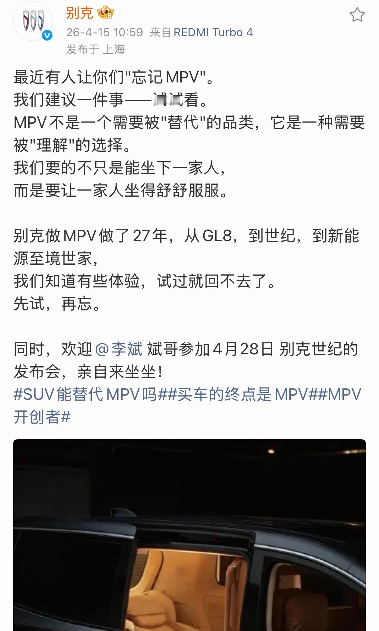 别克邀请参加发布会:最近有人让你们"忘记MPV"。我们建议一件事——试试看。大v