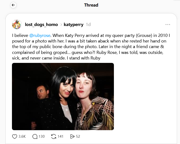 Lia Tilson:“我绝对相信Ruby Rose,2010年,Katy Perry来参加我的同志派对(Grouse),我和她合影。拍照时,她突然把手放在我的耻骨上,这让我有点措手不及。当晚晚些时候,一位朋友过来抱怨说自己被摸了……你猜是谁?!据说是Ruby Rose,她当时在外面,生病了,没进来。我支持Ruby。”
