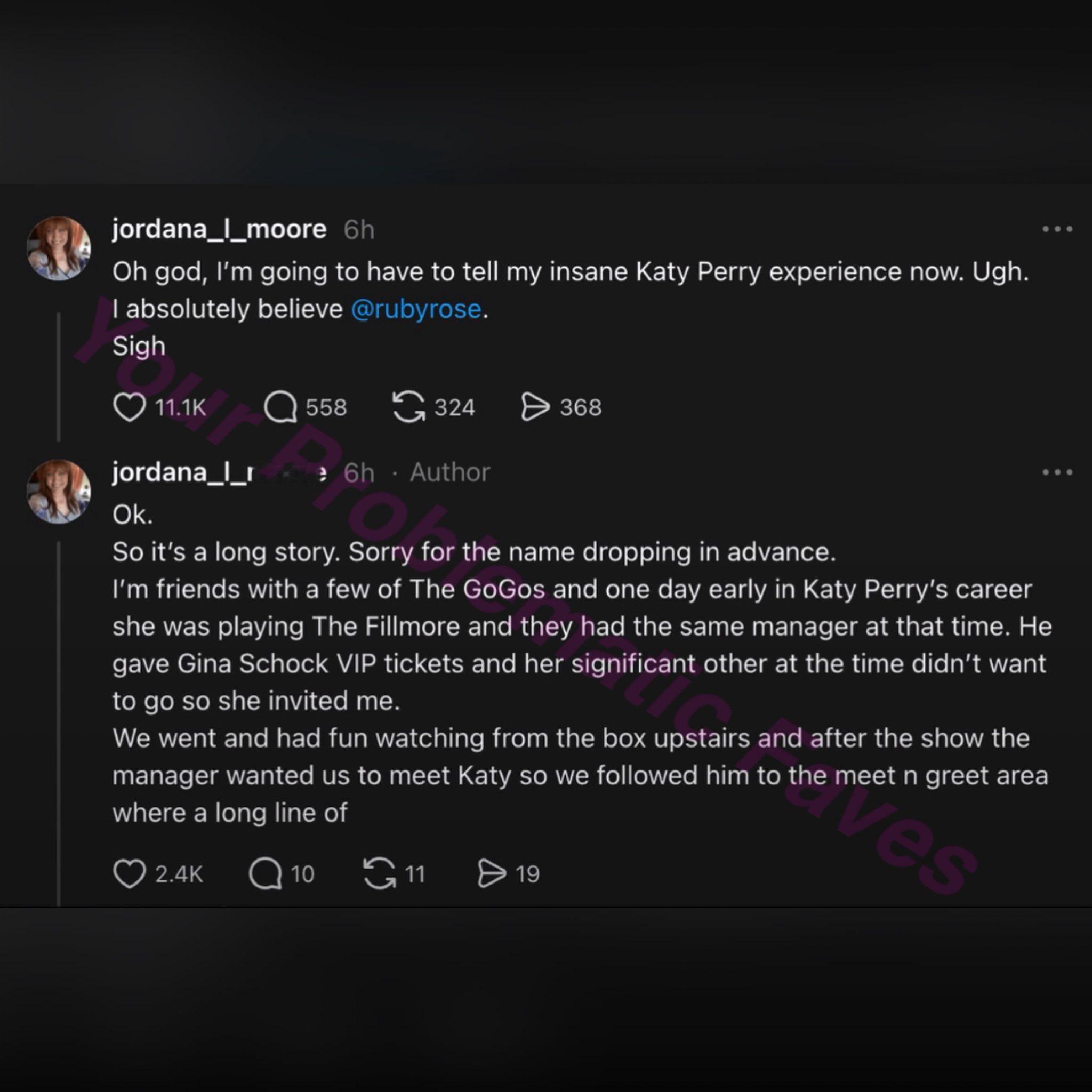 Jordan L'Moore:“我和 The Go-Go's 乐队的几位成员是朋友。在 Katy Perry 职业生涯早期的一天,她在 Fillmore 剧场演出,当时她和 The Go-Go's 共用一个经纪人。经纪人给了鼓手 Gina Schock 几张 VIP 门票,Gina 当时的伴侣不想去,于是她邀请了我。我们去了现场,在二楼包厢看得很开心。演出结束后,经纪人想让我们去见见 Katy,于是我们跟着他去了粉丝见面区,那里有一长排正等得不耐烦的青少年女孩。我们被带到了队伍最前面,等了好一会,Katy 出来了。