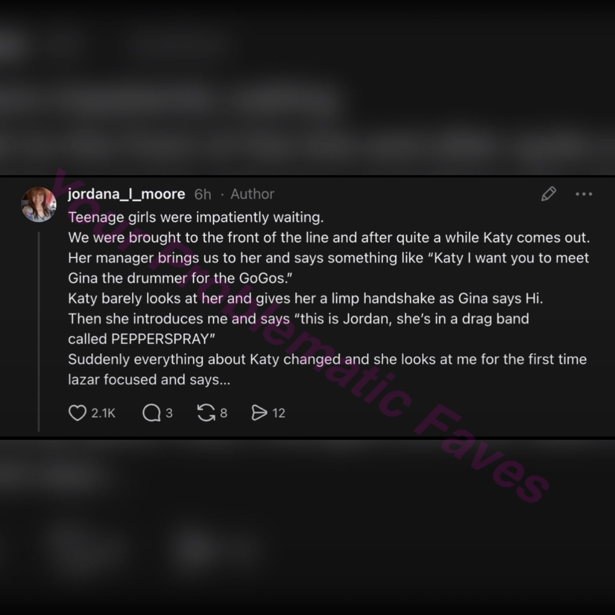 经纪人带我们走到她面前,说道:‘Katy,我想让你见见 Gina,她是 The Go-Go's 的鼓手。’ Katy 几乎正眼都没瞧她一下,在 Gina 打招呼时只是敷衍地握了下手。 接着,经纪人介绍我:‘这是 Jordan,她在一个叫 PEPPERSPRAY 的变装皇后乐队里。’