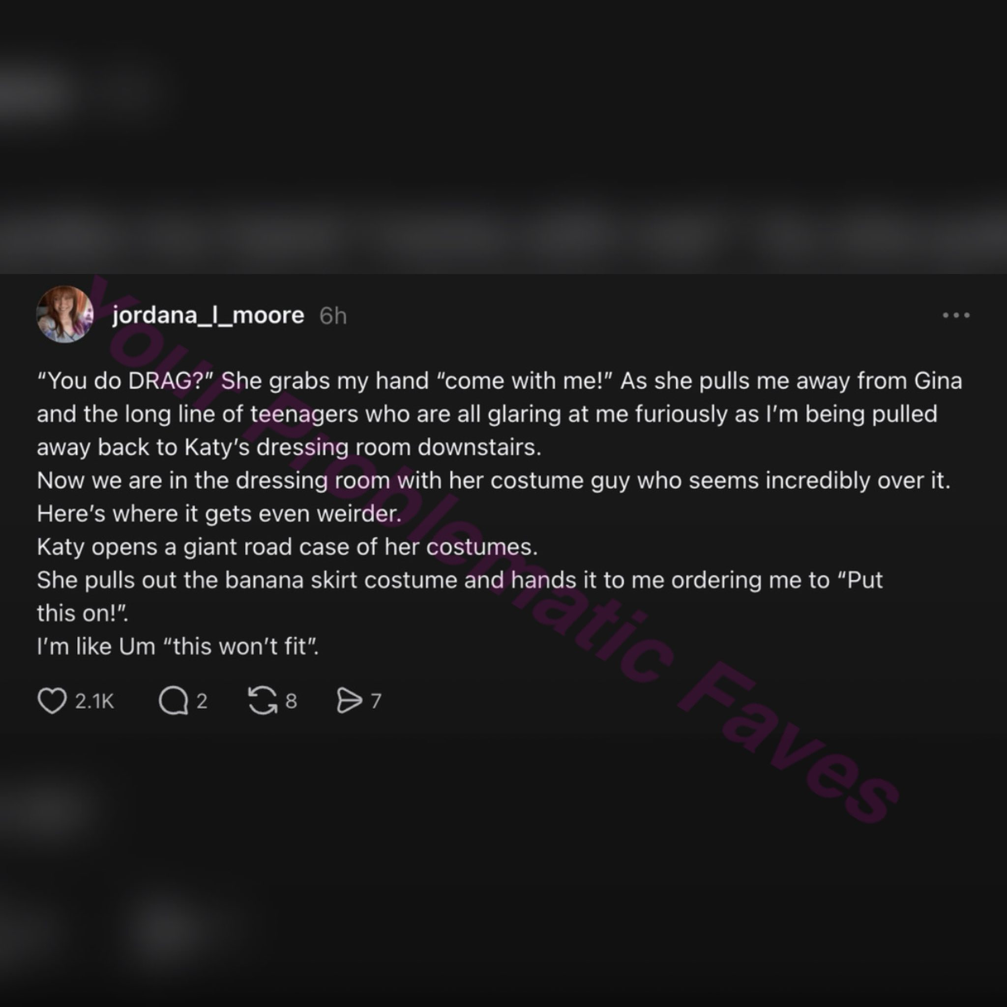 此时,我们和她的服装师待在更衣室里,那名服装师看起来已经对此见怪不怪、甚至有些厌烦了。接下来的事情变得更加诡异。