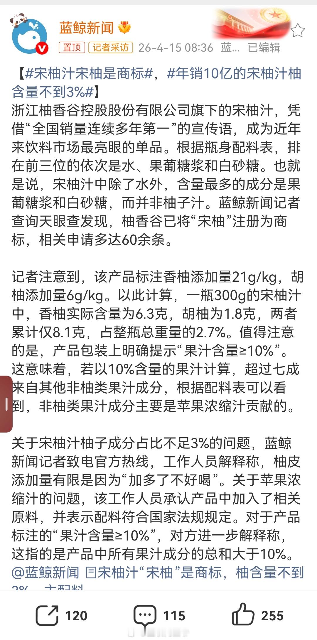 年销10亿的宋柚汁柚含量不到3%哈哈哈我们浙江人应该没少喝柚香谷,