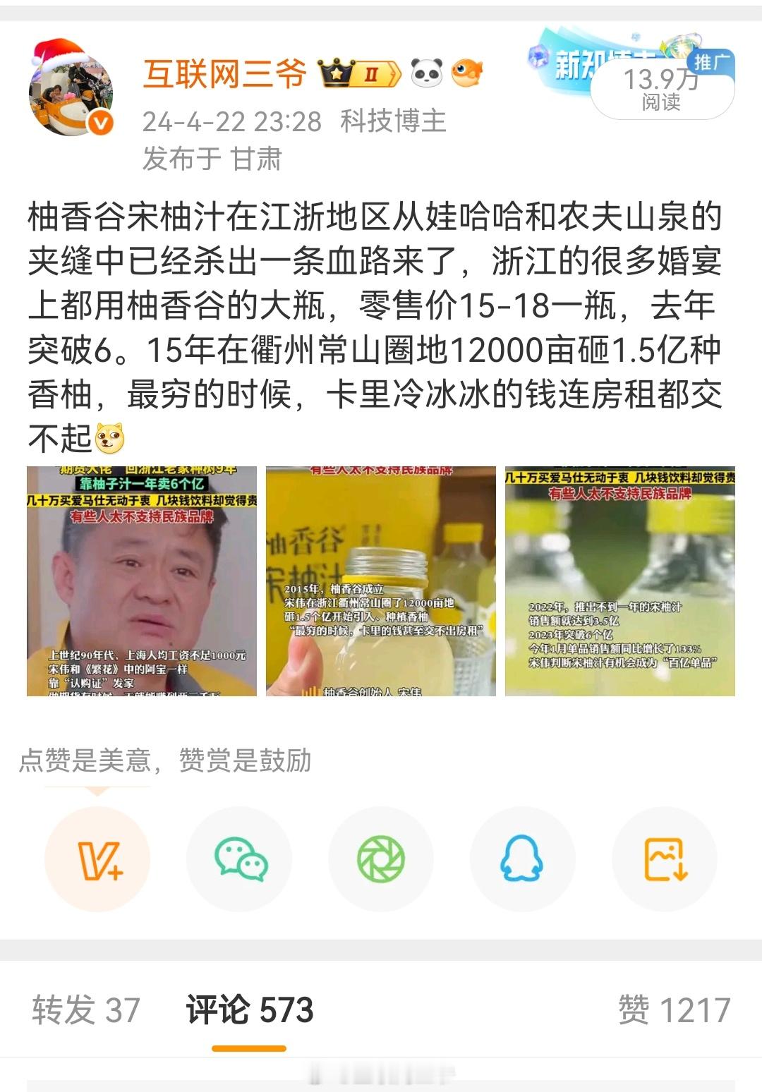 柚香谷宋柚汁在江浙地区从娃哈哈和农夫山泉的夹缝中已经杀出一条血路来了,15年在衢州常山圈地12000亩砸1.5亿种香柚,最穷的时候,卡里冷冰冰的钱连房租都交不起