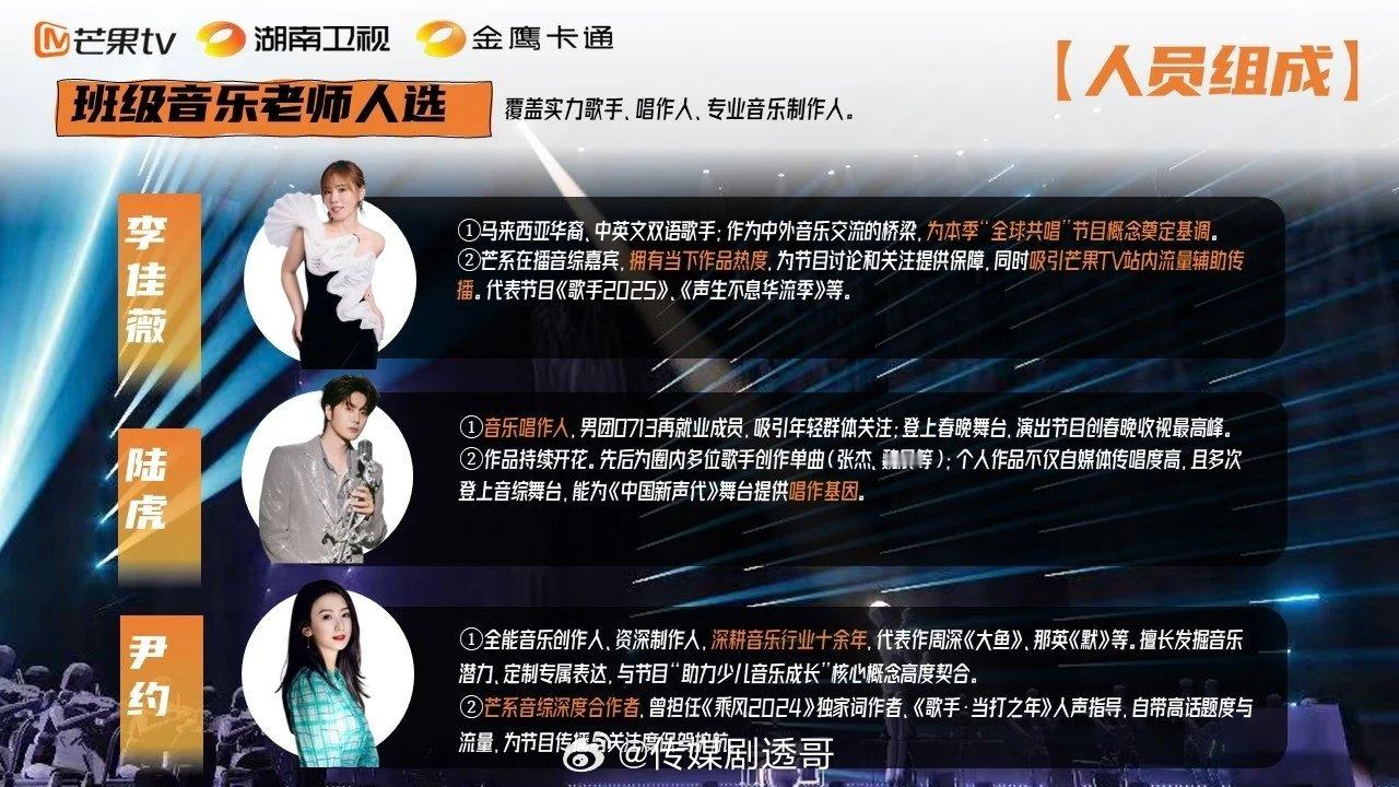 🥭中国新声代2026拟定暑假档播出嘉宾:李佳薇、陆虎、尹约主持:谭薇平台:湖南卫视+金鹰卡通+芒果tv