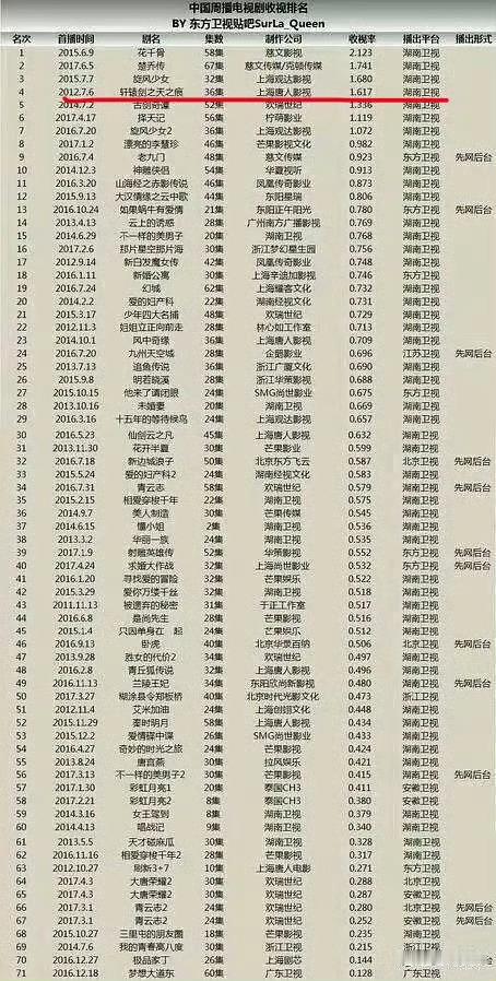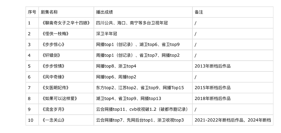 刘诗诗女主剧台网爆剧统计:1️⃣《聊斋奇女子之辛十四娘》四川公共,海口,南宁等多台卫视年冠2️⃣《怪侠一枝梅》 (深卫半年冠)3️⃣《步步惊心》 (网播top1创记录,湖卫top6,省卫top9)4️⃣《轩辕剑》 (周播top1创记录,省卫top7,网播top2)13年断档5️⃣《步步惊情》( 网播top8,浙卫top4)6️⃣《风中奇缘》(网播top6,周播top2)15年断档7️⃣《女医明妃传》(东方top2,江苏top2,省卫top9,网播Top15)18年断档8️⃣《如果可以这样爱》(湖卫top4,省卫top9,网播top13)9️⃣《流金岁月》(云合网播top11,cvb收视破1.2,破都市剧记录)21-22年断档🔟《一念关山》(云合网播top7,先网后台top1,浙卫收视top3) 24年断档刘诗诗