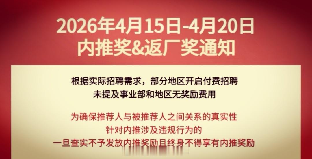 4月15-20日,比亚迪整车制造部(11部)多个基地(常州、抚州、合肥、深汕)对新入职的普技工给予2000-3000元不等的入职奖励。