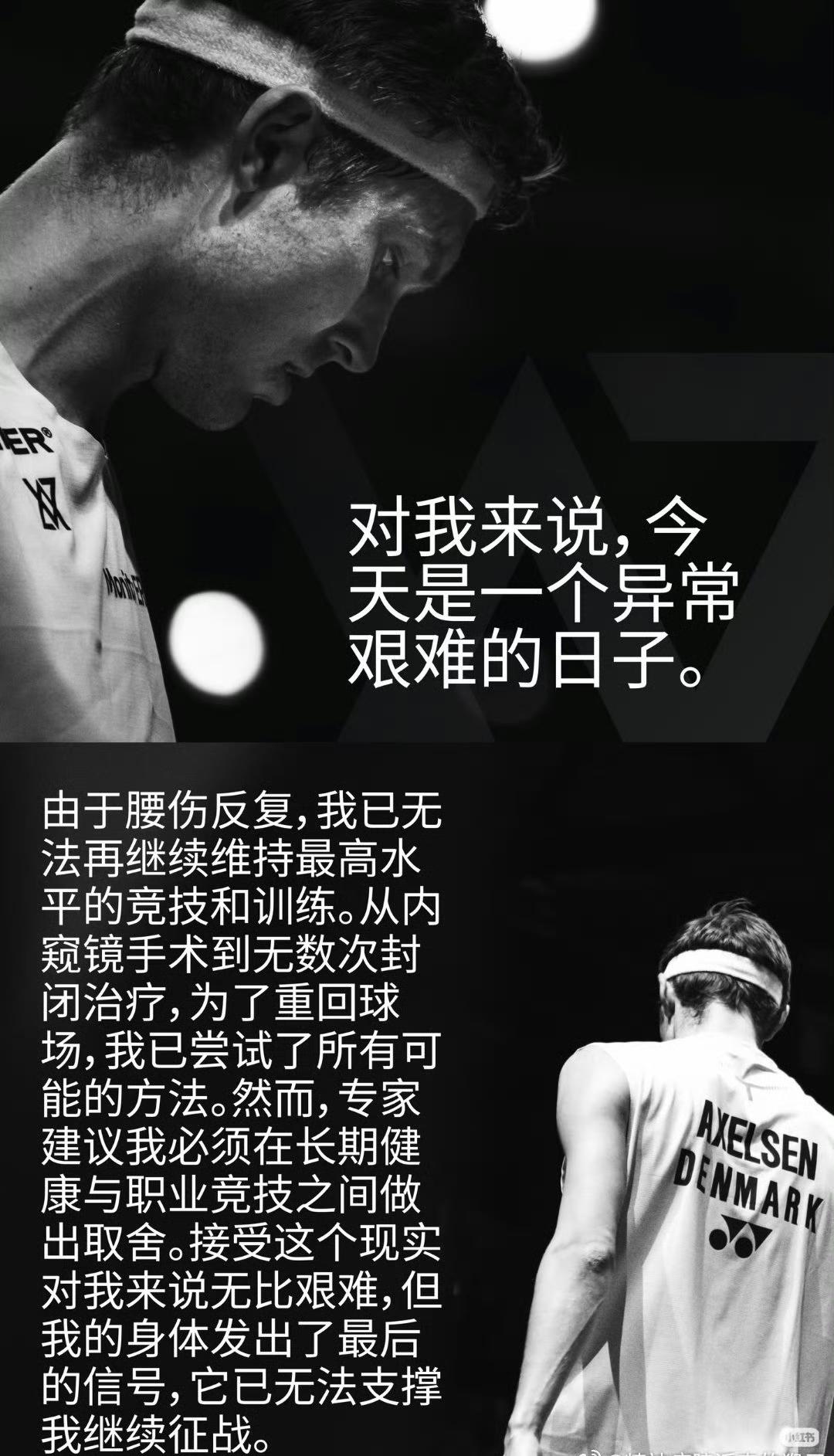 丹麦羽毛球名将安赛龙🇩🇰今天发文退役! 安赛龙的腰伤已经严重到无法继续打球,而且是做手术都不能恢复的那种,今天他宣布退役,也是意料之中的事了,伤也严重,年龄也大了,复出估计也很难顶住现在00后甚至05后的冲击了。 这样一来,欧洲的两位霸主,一个安赛龙🇩🇰,一个马林🇪🇸,目前都是历史第二人,都选择了在今年退役。 作为林丹之下的第一人,安赛龙两金一铜的奥运战绩,荣誉已经不少了,昨天还在媒体上看到他聊起他的统治期,今天就宣布退役,宣布的有点儿突然了。 冲击洛杉矶奥运会失败,奥运三连冠失败,祝安赛龙退役快乐[给你小心心]!