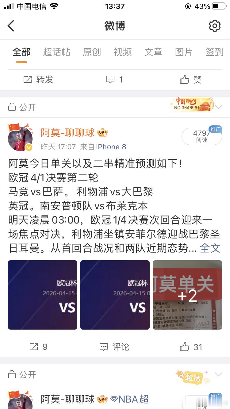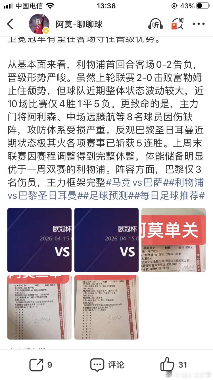 阿莫昨日欧冠单关以及二串三串,全部精准拿捏!so easy!马竞2比1巴萨 大巴黎2比0利物浦南安普顿3比0布莱克本马竞终于又晋级欧冠四强了,大巴黎也成功进入四强、今晚欧冠焦点战阿森纳vs里斯本,拜仁vs皇马!小伙伴们有需要足球篮球赛事资讯的可以到阿莫置顶粉丝👗1👗找阿莫哈!总👗满了!足球预测每日足球推荐竞彩足球推荐