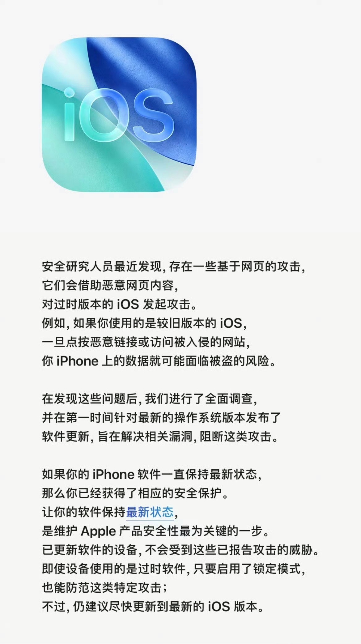 苹果官方发文提醒我之前就发博说了,系统更新最重要的是修复了安全漏洞,让不法分子要花更多时间才能破解,出于自己的安全考虑,尽量更新系统