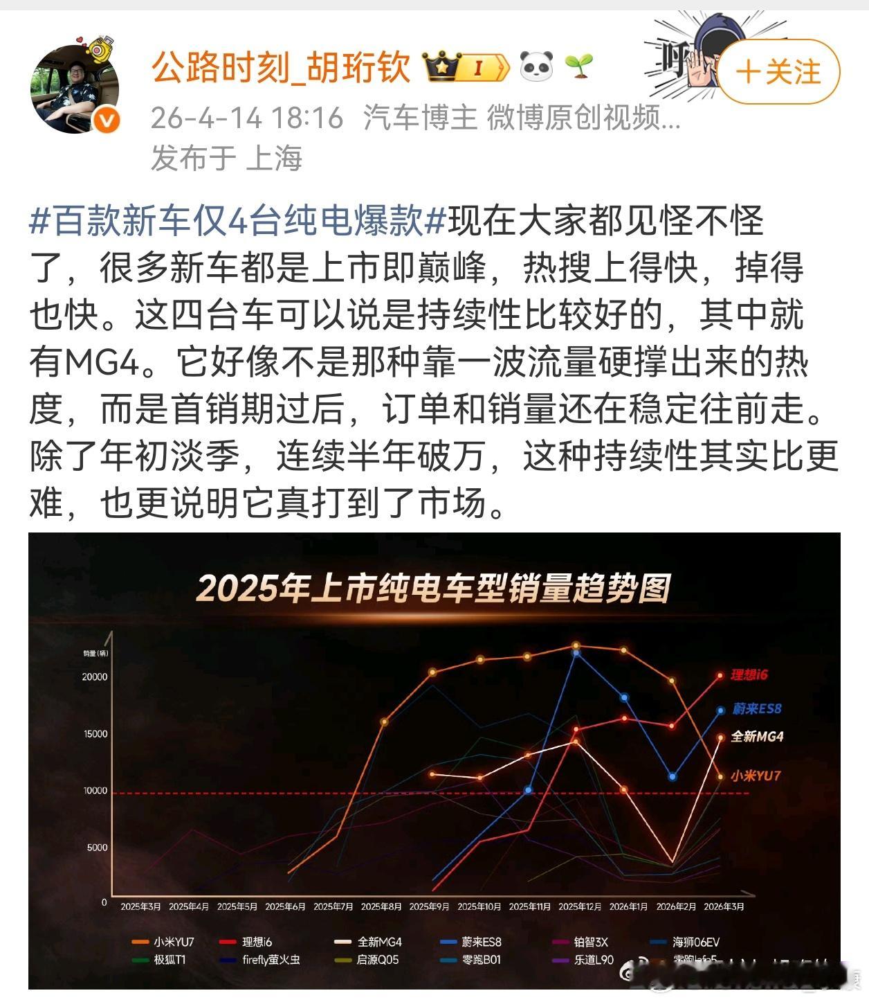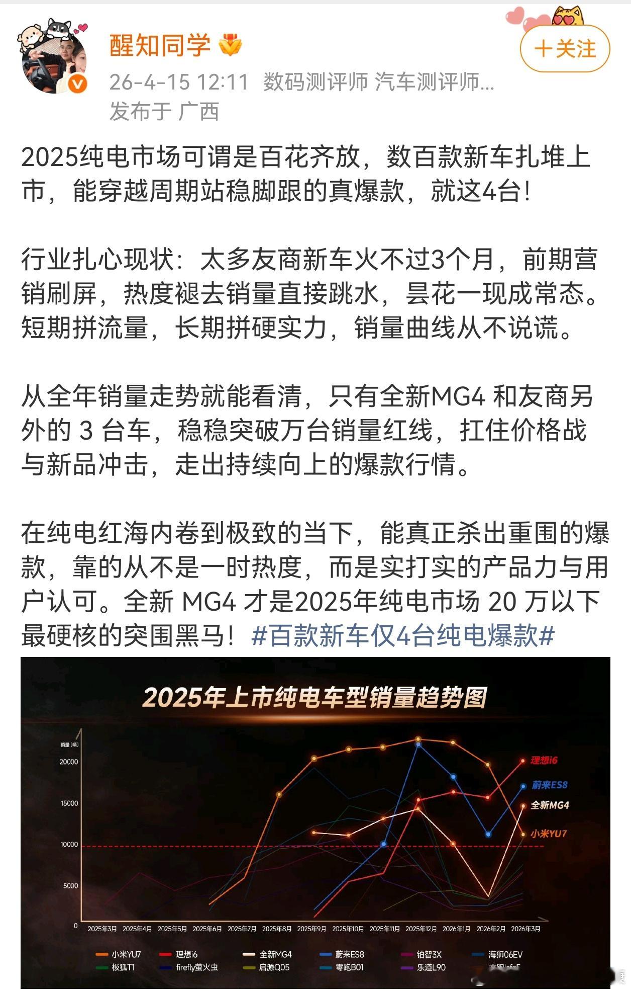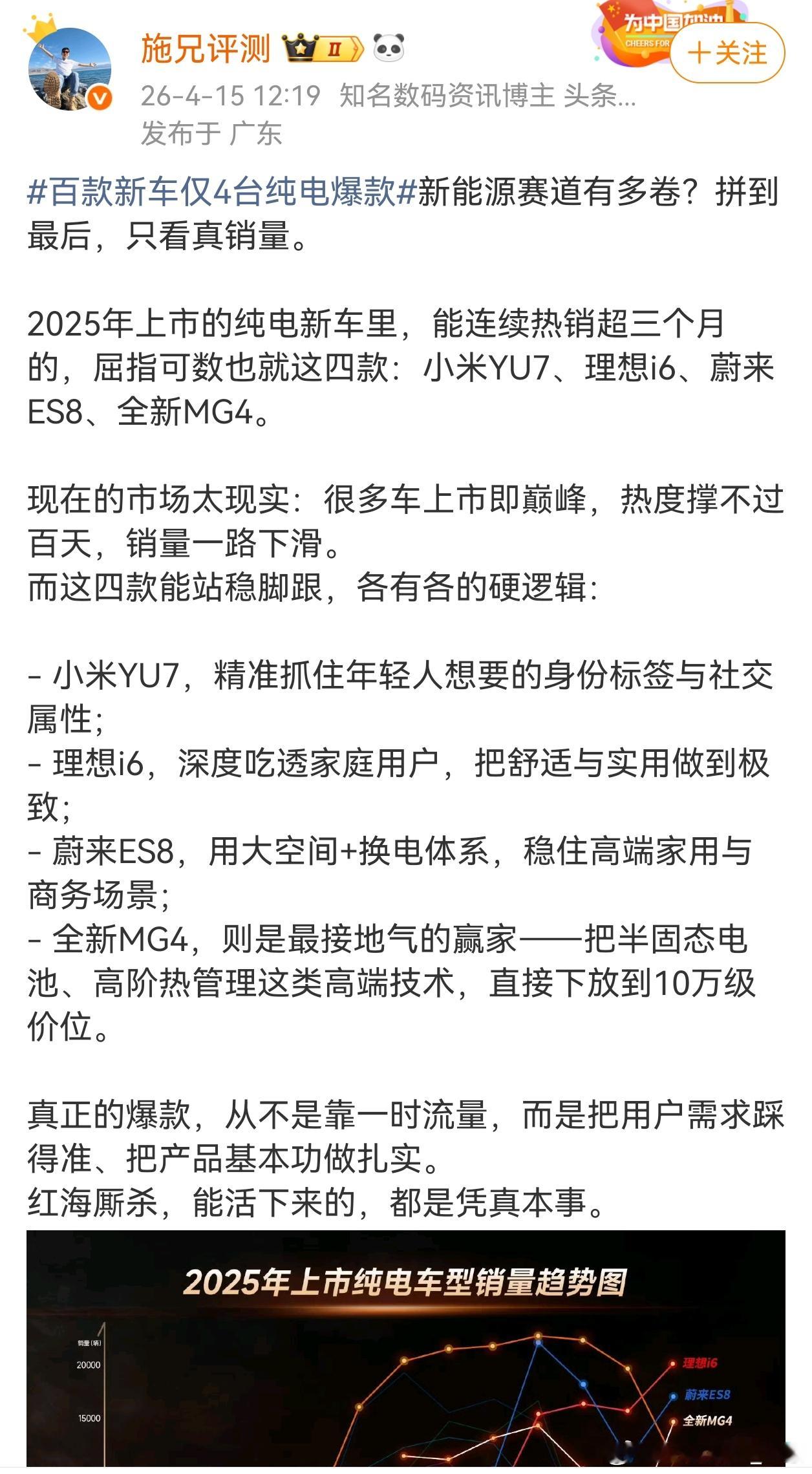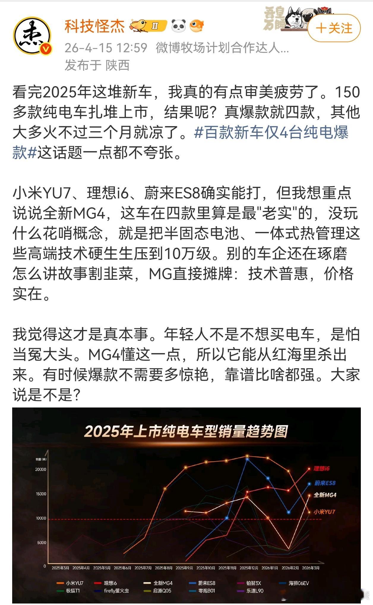 百款新车仅4台纯电爆款还是看不明白,名爵MG4怎么和小米YU7、理想i6、蔚来ES8排在一起的???