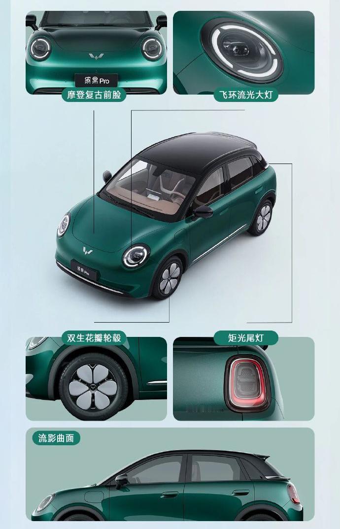 【5.88万元起,五菱缤果Pro开启预售】 日前,汽车焦点从五菱官方处获悉,全新缤果Pro正式开启预售,新车预售价格区间为5.88-7.28万元,预计会在二季度内正式上市。其实从命名上就不难看出,缤果Pro的定位要高于缤果,同时这台新车还将标配快充以及外放电功能,搭载最大功率65千瓦的前置驱动电机,纯电续航分别为330km以及403km,更能满足现在用户的出行习惯。 造型方面,全新缤果Pro延续了复古感十足的设计语言,圆润的车体线条搭配圆形灯组看起来非常可爱,并且内部的环形灯带还采用了三段式弧线处理,点亮后不论是层次感还是科技感都足够出色。 同样新车尾部也有着相当浓厚的复古气息,车顶运用黑化造型处理,两侧还提供个性化的改装方案,进一步强化视觉效果,圆形的尾灯组与车头形成呼应,整体设计感非常到位。尺寸部分,全新缤果Pro长宽高分别为4050/1758/1580mm,轴距2560mm,车内空间也是一大核心卖点。 内饰部分同样强调时尚感,极简的座舱造型搭配Ling OS灵语车机系统带来足够优秀的交互体验。虽然外部尺寸不大,但缤果Pro座舱设计了25处储物空间,各种细碎物品都有专属的储物空间,实用性和乘坐舒适度都值得肯定。【来自懂车帝车友圈】