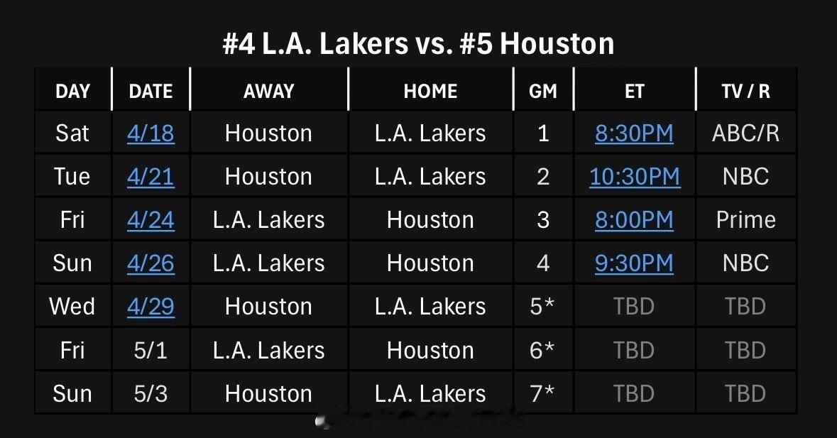 NBA官方公布了火箭vs湖人这轮系列赛的完整竞赛日程,详情如下(北京时间,主队在后):