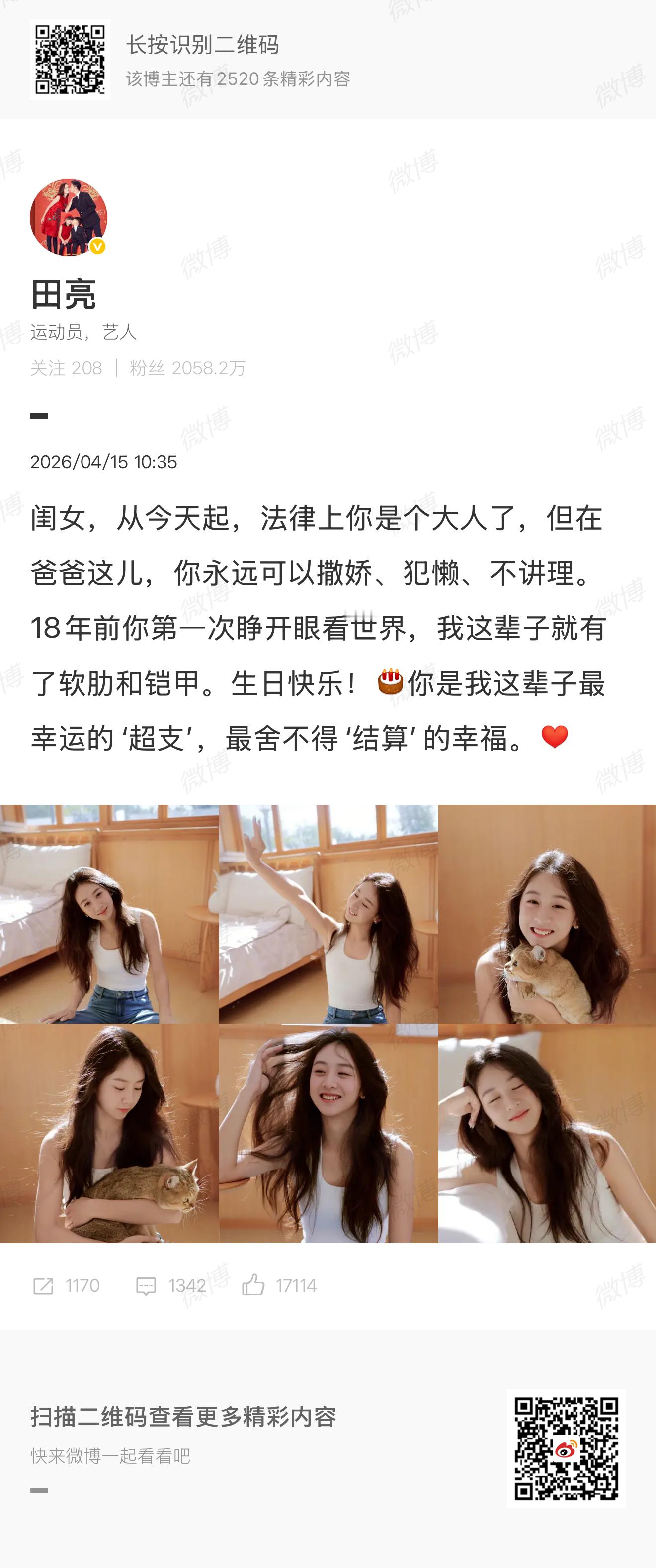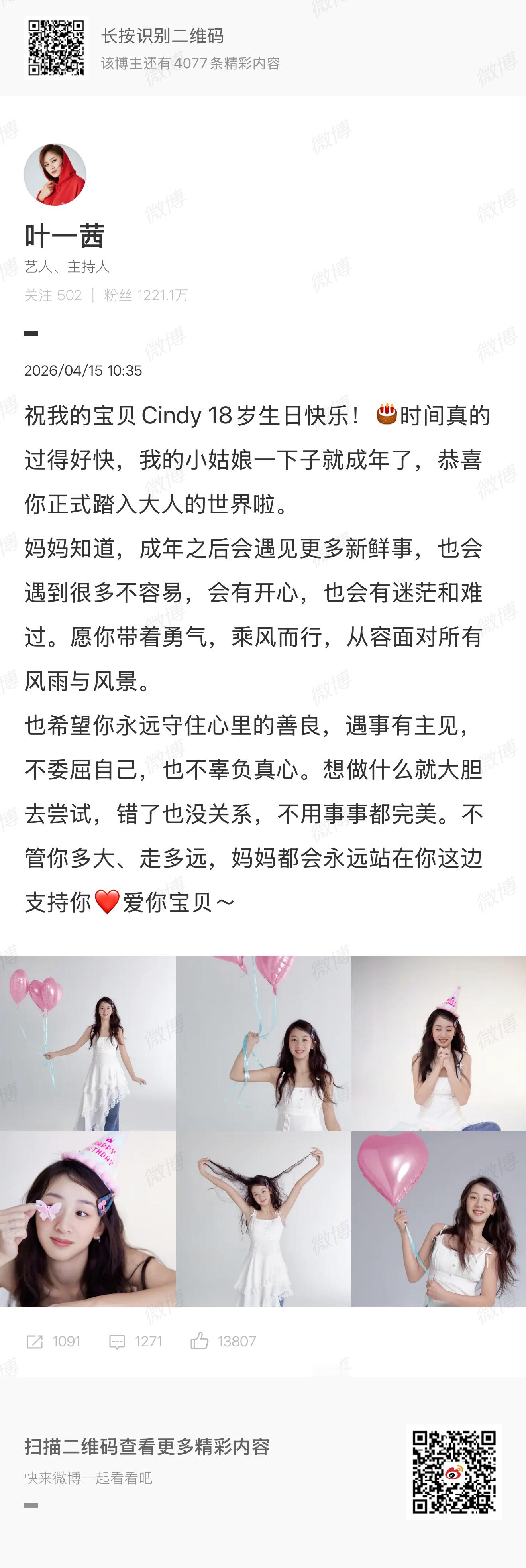 发文:祝我的宝贝Cindy 18岁生日快乐!时间真的过得好快,我的小姑娘一下子就成年了,恭喜你正式踏入大人的世界啦。妈妈知道,成年之后会遇见更多新鲜事,也会遇到很多不容易,会有开心,也会有迷茫和难过。愿你带着勇气,乘风而行,从容面对所有风雨与风景。也希望你永远守住心里的善良,遇事有主见,不委屈自己,也不辜负真心。想做什么就大胆去尝试,错了也没关系,不用事事都完美。不管你多大、走多远,妈妈都会永远站在你这边支持你❤️爱你宝贝~ 森碟18岁了