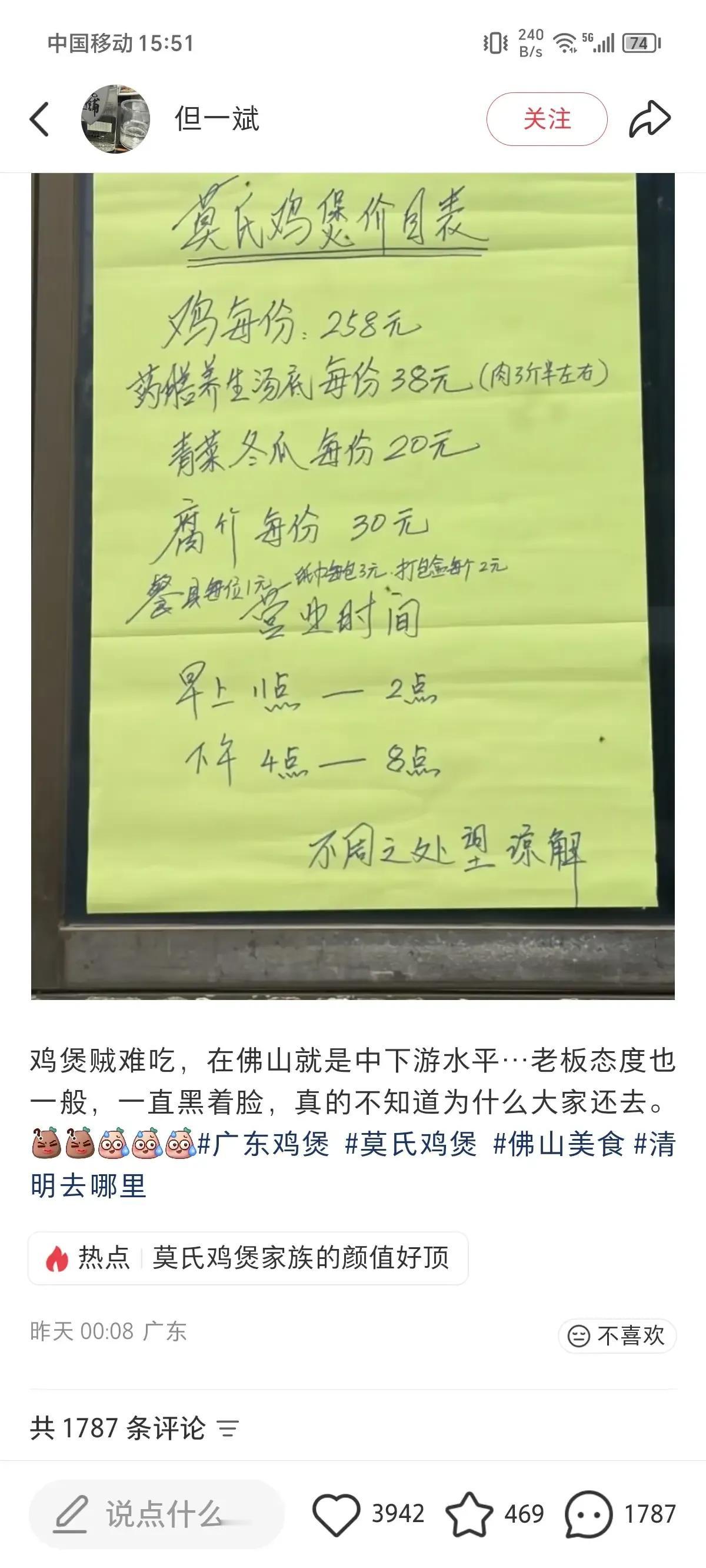 事情荒诞就荒诞在这,流量裹挟下你无路可退! 清明节前后,广东顺德的“莫氏鸡煲”彻底在网上炸开了锅。 爆火后,面对网传的“当地文旅部门施压不让休假”,官方出来辟谣了:没有逼迫,老莫坚持营业是“自愿”的,是为了宠粉,不想粉丝们白跑。 话说得很漂亮,但老莫真的有得选吗? 几百人堵在村口,连警车都出动了,2000平米停车场生生被村里连夜开辟出来了………各方反应神速,甚至职能部门都在配合开绿灯,为的就是想借美食让地方接住这波流量。 万事俱备,这时候你让一个原本一天只想卖十只八只鸡的老板说“我不干了”? 要是真歇业,“耍大牌”、“飘了”、“忘本”的帽子扣下来,以后还要不要再开门做生意了?网络舆论可以捧你上天,也就能把你摁在地上。 这种“自愿”,不就是被流量裹挟,被架在火上烤的无奈妥协么? 排队7小时,鸡煲真的好吃到飞起吗? 其实不然,有人吃过就说了没啥特别的。 说到底,大家稀罕的,只是这个处处皆营销的流量时代里“老板不想红”的极其稀缺的反差感而已。 但代价是,老莫一家人的真实生活被彻底碾碎。 传统手艺没法与流水线作业相比,活鸡现杀、老火慢熬,药酒自泡,全靠一家人的身体在硬扛。这不,听说已经在采用某品牌的鸡只在替代了。 我们总认为“流量来了,泼天富贵”是好事,但对只想安稳过日子的小生意人来说,这可能是一场猝不及防的灾难。 等鸡场的鸡杀光了,自泡酒喝完了,老莫也累垮了,那些排队的人,吃饱喝足,打卡完毕才肯散去,可他们会心疼老莫一点点吗?到时候留在他面前的,可能就只有一地鸡毛和一家再也回不去的农家小店。 据说老莫现在盼星星盼月亮的,大概是这波热度赶紧过去,让他能回到晚上去KTV吼两嗓子的平凡日子。 如果你是老莫,面对这“意外流量、泼天富贵”,你有勇气说“不”吗?还是你也会一边喊着"太累了别来呢",一边又在凌晨两点麻溜杀鸡? 莫氏鸡煲老板:限号后个个都骂我 莫氏鸡煲 今日热点我来评 发优质内容享分成 头号创作者激励计划 社会百态