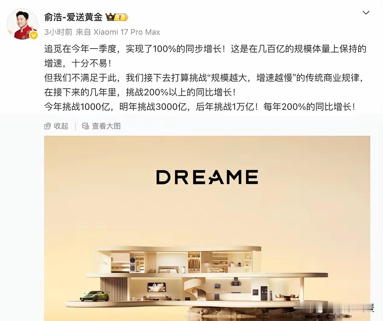 今年1000亿,明年3000亿,后年10000亿!你可以为了营销搞噱头,毕竟有了流量就会有销路,但是你不能把大家的智商和商业规律按在地上摩擦。 这个目标,我们普通人真不敢想。也许俞浩不是普通人。去豆包问了下,还真不一般,清华学霸,无人机初期创业者,扫地机器人世界第一,立志五年世界首富,手机行业要与小米华为三分天下。 现在是追觅电动汽车,也要做世界第一。 第一次看到追觅这个品牌,还是今年春晚,可见其志不在小。 但是,先制造点噱头,给自己打打知名度,无可厚非。毕竟营销分好多种,有靠品质取胜,有靠老板魅力取胜,也有靠讲故事赢得人心。 靠吹牛打开知名度的也有,比如乐视贾跃亭,现在已经实现了美国梦;也有吹过的牛都实现了的,比如大嘴余承东。 但是,他们各种营销,包括吹牛,都没有违背商业规律。 看看现在各界大佬的年营收,看看俞浩是怎样把商业规律放到地上狠狠滴摩擦的。 这是去年一些高科技公司的营收额,他们都威名赫赫,创业都在20年以上了。 京东:13091 亿 阿里巴巴:9963 亿元 华为:8809 亿元 比亚迪:8040 亿元 腾讯:7518 亿元 联想:6059.5亿元 小米:4573亿元。