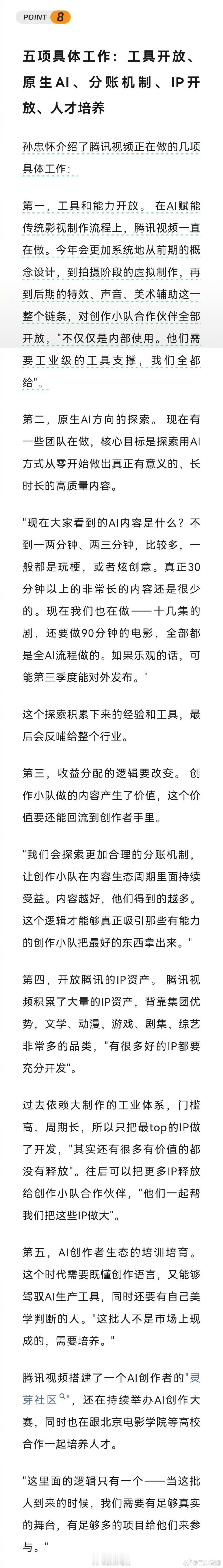第十三届中国网络视听大会主论坛。腾讯公司副总裁孙忠怀透露腾讯一些团队在尝试全AI流程做的长剧、电影,可能第三季度能对外发布!腾讯AI长剧Q3上线