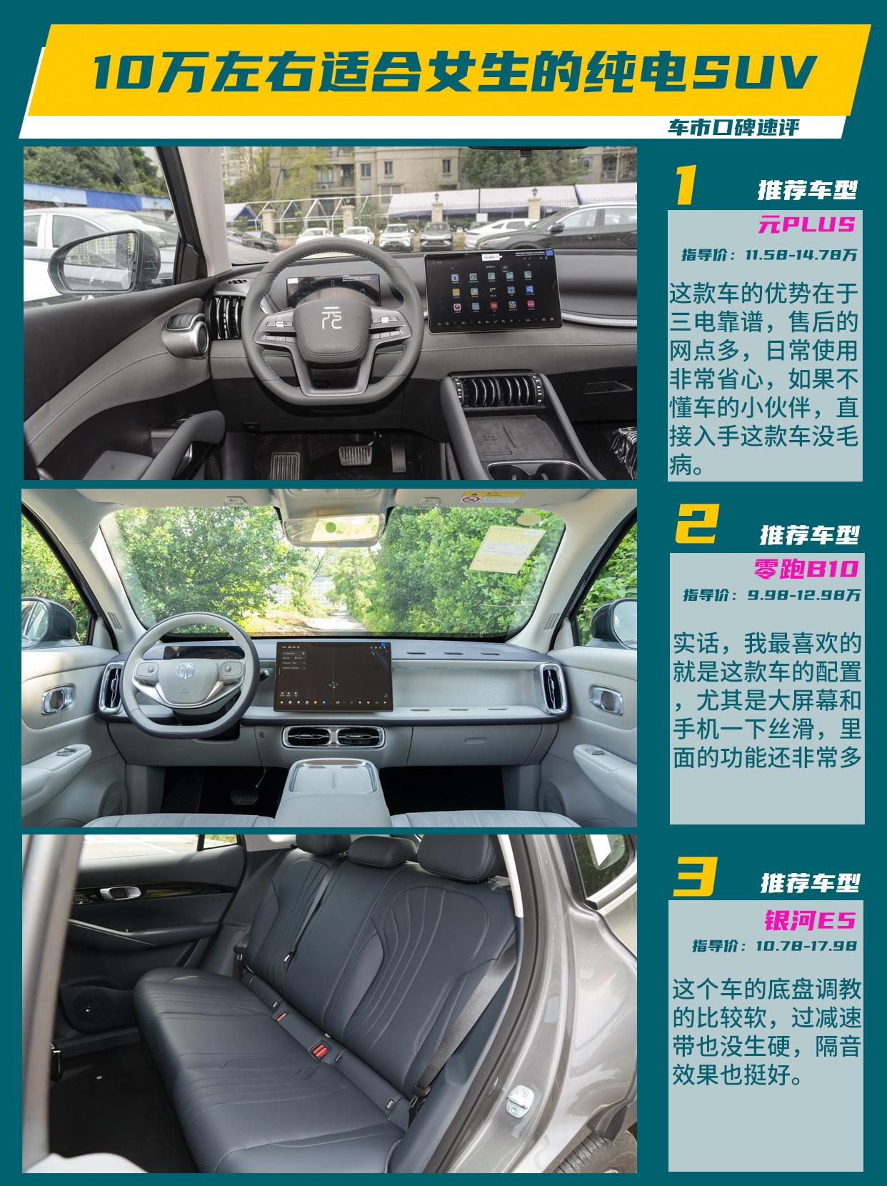 预算10万左右,想买辆新能源SUV,不能只看颜值,今天给大家介绍3款热门的车型,分别是元PLUS、银河E5、零跑B10,看看有没有你喜欢的。 1、元PLUS,厂商指导价11.58-14.78万 元PLUS是一员老将了,热度一直挺高的。它的外观属于耐看型的,看上去有点圆润还带着较强的动感,看上去很顺眼。这款车的优势在于三电靠谱,售后的网点多,日常使用非常省心,如果不懂车的小伙伴,直接入手这款车没毛病。 槽点:经常能碰见车友,所以车谈不上个性。 2、零跑B10,厂商指导价9.98-12.98万 零跑B10也是一款热门车型,颜值走的是清爽简约风,看上汽挺有未来感的。说实话,我最喜欢的就是这款车的配置,尤其是大屏幕和手机一下丝滑,里面的功能还非常多,适合喜欢智能配置的年轻人去选。 槽点:有一部分人反应中控台的设计有点个性,仁者见仁吧。 3、银河E5,厂商指导价10.78-17.98 银河E5的整体车身比例非常协调,没有什么复杂的设计,看着干净利落,给人一种暖男的感觉。这个车的底盘调教的比较软,过减速带也没生硬,隔音效果也挺好。重要的是储物空间也比较丰富,随身带的小物件都能挺好的放置。 槽点:这款车挺有竞争力的,就是价格太坚挺,便宜点就更好了。 三款车都是比较能打的选手,怎么选呢?如果看重稳定放心,就选元PLUS,科技感选择零跑B10,驾乘舒适选择银河E5,打不上最好自己去试驾一下。【来自懂车帝车友圈】