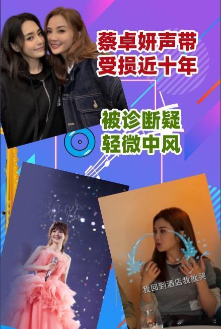 蔡卓妍声带受损近十年被诊断疑轻微中风 想不到年纪轻轻的她怀疑自己轻微中风啊! 话说阿Sa蔡卓妍最近接受好朋友胡彦斌网络节目专访得时候就惊爆自己因为饱受声带受损困扰去寻医问药被医生怀疑轻微中风啊! 原来蔡卓妍系差不多十年前发现自己声带和一般人不一样,具体表现为发出“一”的声音的时候,声带会呈现一长一短,唯有靠打针蔡可以开音,这些细微的不同如果是普通人可能不觉得,但蔡卓妍是个歌手,因为声带问题导致在舞台上唱歌破音饱受困扰,后来她实在忍无可忍去看著名中医,结果对方怀疑她曾经轻微中风啊。 不过也可能是被怀疑轻微中风的经历令到阿sa决定打破以往快节奏的生活方式,开启不一样的人生篇章阿,究竟阿sa现在的心境是怎样的?我将会稍后在文章里分析。