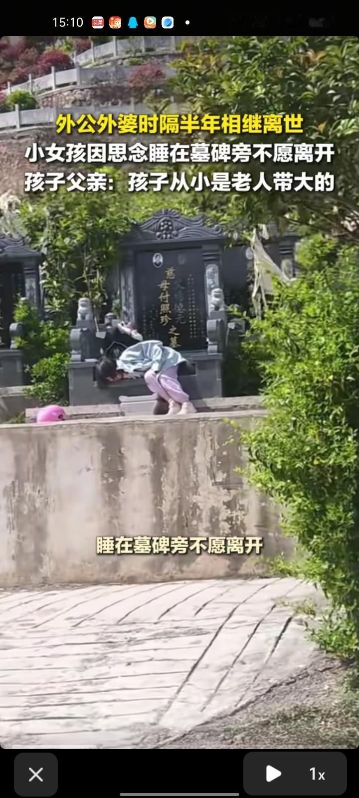 4月14日,贵州六盘水。外公和外婆相隔半年离世,小女孩因太思念老人,睡在墓碑旁不愿离开,小小的身躯全是藏不住的无助与思念。 孩子爸爸称,自己工作繁忙,孩子妈妈又常年患病,女儿从小就由外公外婆悉心照料。如果外婆已离世半年,外公已离开了二十天。 孩子吵着要去看外公外婆,到墓碑前却怎么也舍不得离开,甚至说要在那睡觉,这让爸爸看了都泪流满面。 这个我也刚想起,大概2022年二月至四月,爷爷和奶奶先后离世了,当时我可是叫所谓的“表姐”过来的,如今“表姐”的微信账号早已注销了。去年四月的清明,我们去爷爷奶奶的坟墓上烧香,还拍了视频
