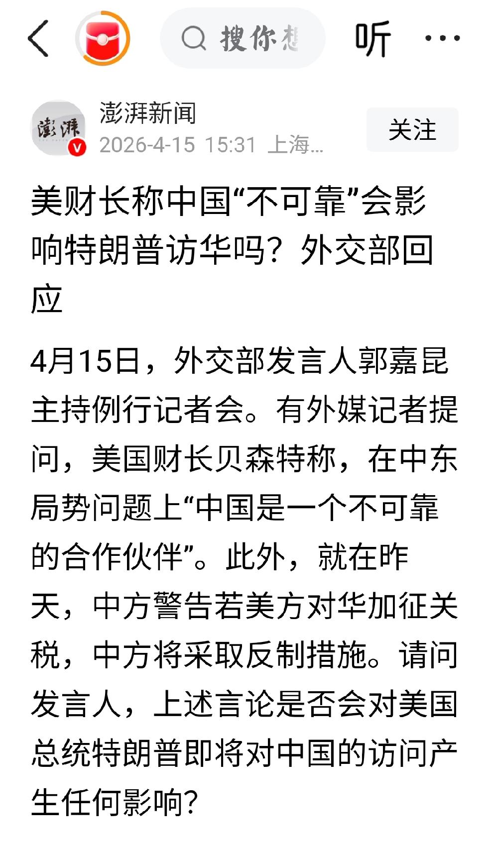 2026年4月15日,澎湃新闻发文:“美财长称中国不可靠,会影响特朗普访华吗?外交部回应,关于美国总统特朗普访华,双方就此事保持着沟通。” 个人认为:中国不会主动恳求美国总统特朗普访华或者用普通话表示:“你愿意来就来,不愿意来可以不来,反正美国及其特朗普所说的话,全是无用话,可以视为废话” 中国不会帮助,也不会选择站在美国一侧。 一个为非作歹多年,只会抢劫欺骗的国家,如何取信于民,取信于国际社会。