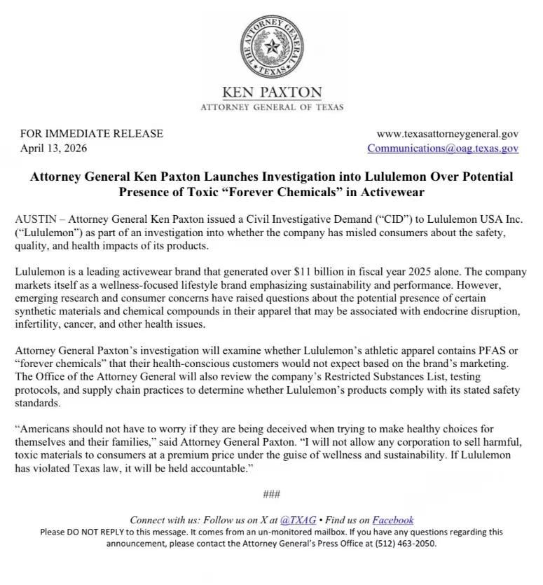 最近 Lululemon 摊上大事了! 主打健康的Lululemon,疑含致癌“永久化学物”PFAS遭到调查,而这种物质和癌症、不孕等健康风险直接挂钩,品牌信任瞬间崩塌。 这记重拳砸在业绩伤口上:叠加2025财年净利下滑近13%,北美市场停滞,股价一年跌去近40%。创始人还在内斗,呼吁品牌“重回高端”。 讽刺的是,唯一亮色是中国市场,增长近三成,新店大都押注于此。曾经的“瑜伽裤之王”,如今在信任与增长的双重夹击下,艰难寻求“自救”。 对主打健康的高端品牌来说,信任比利润重要得多。现在 Lululemon 该做的不是搪塞,而是公开成分、召回问题产品、给出赔偿方案,别等中国消费者彻底失望,把唯一的救命稻草也给作没了。