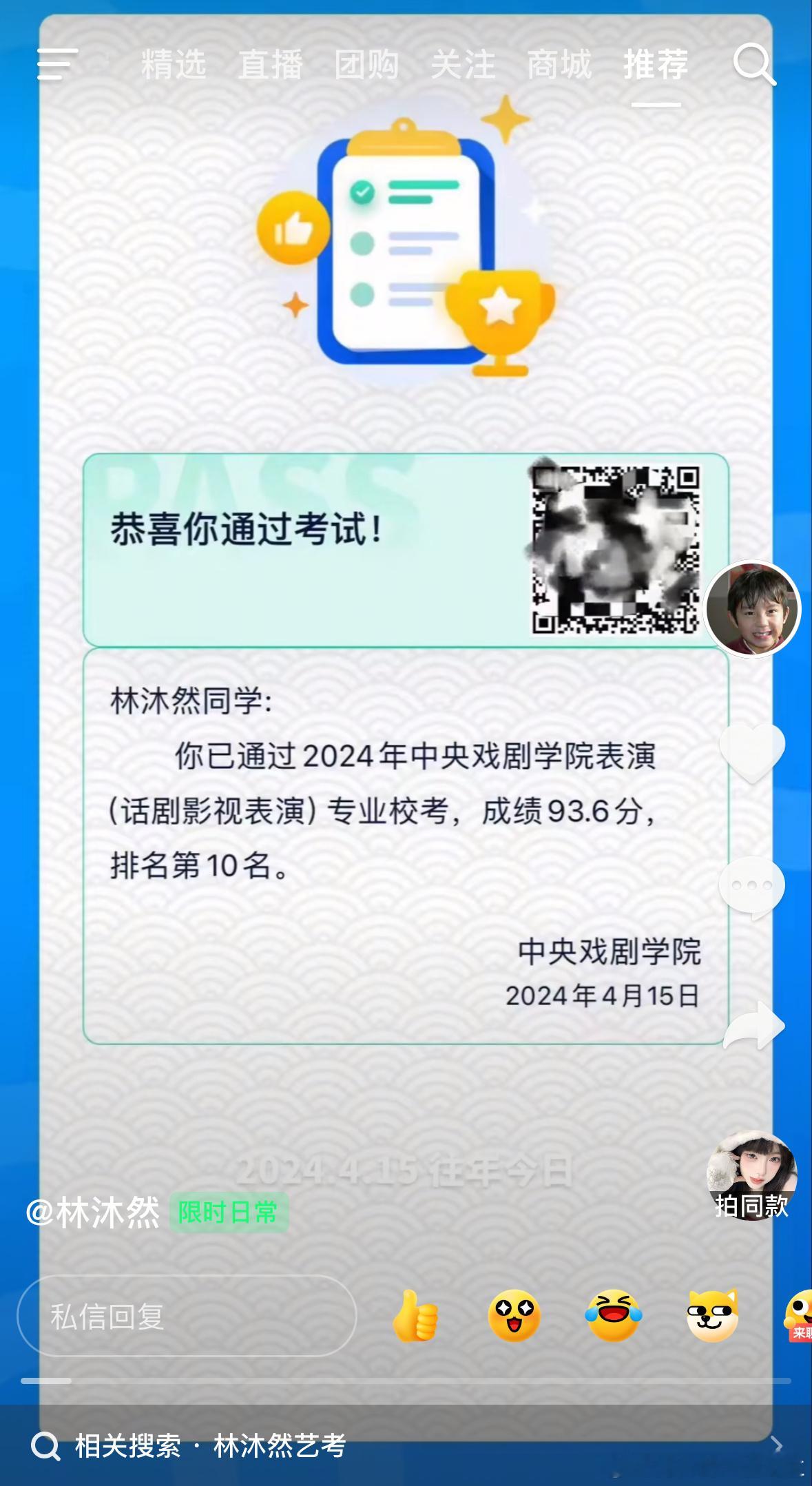 臭屁小孩哥林沐然🎵的往年今日中戏话剧影视表演第10名,看来是很自豪这个成绩了