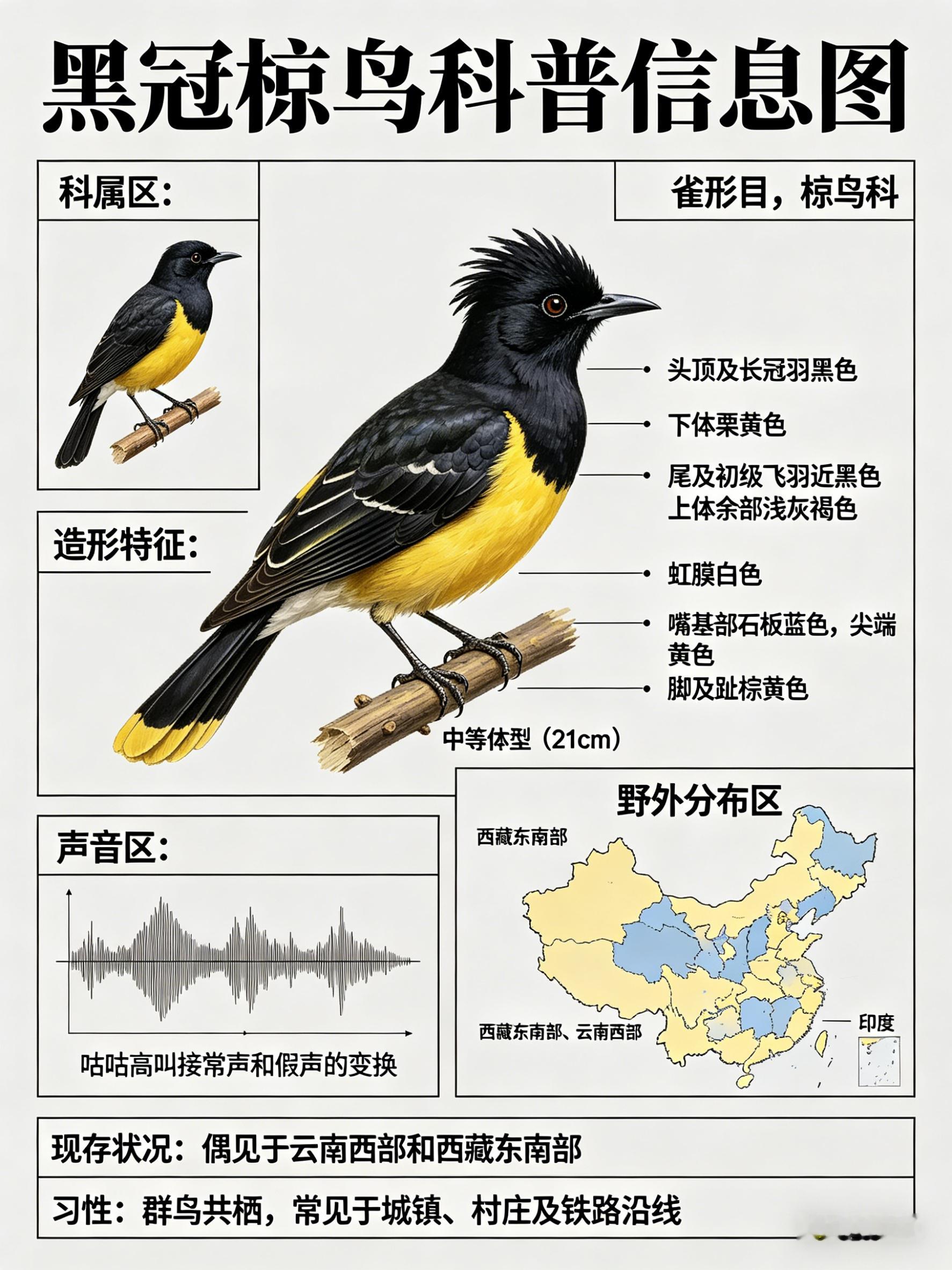 ·外形特征:中等体型(21cm)的椋鸟。头顶及长冠羽黑色,下体栗黄色,尾及初级飞羽近黑色,上体余部浅灰褐色。虹膜白色;嘴基部石板蓝色,尖端黄色;脚及趾棕黄色。