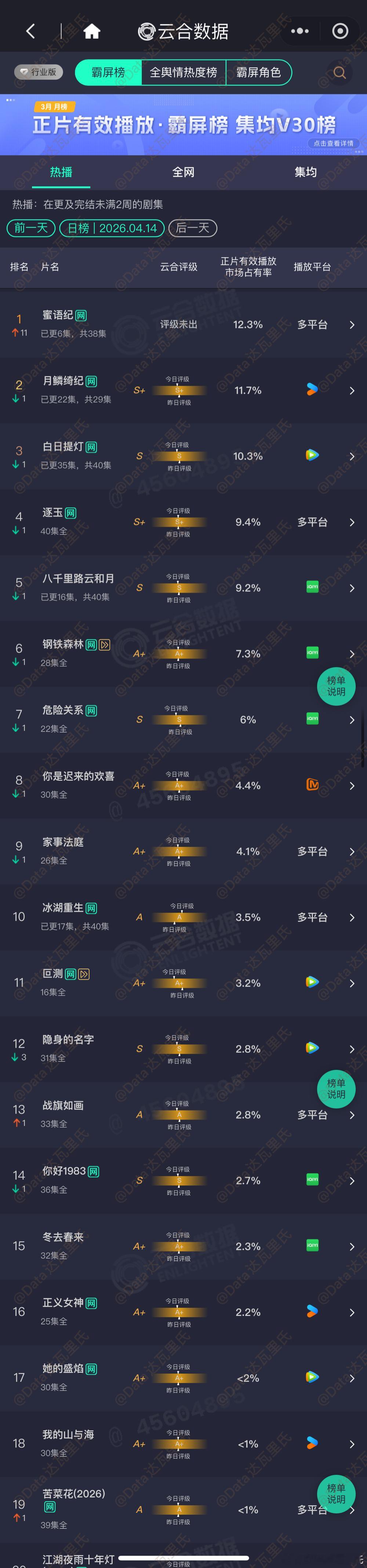 4.14云合占比蜜语纪云合12.3%登顶次日 2100万上下月鳞绮纪 11.7%,1990万上下白日提灯 10.3%,约1750,今晚超点?逐玉 9.4%,约1600万八千里路云和月 9.2%,约1565万钢铁森林 7.3%,约1240万冰湖重生 3.5%,约595万