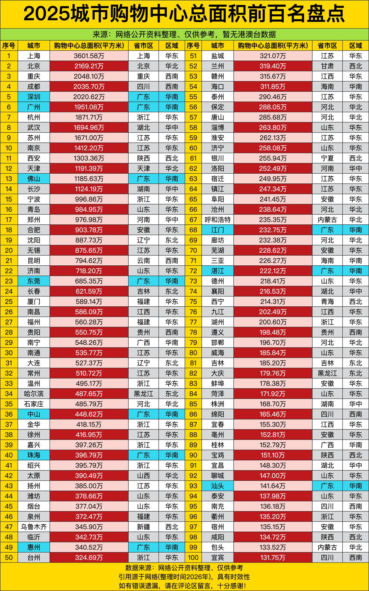 魔都上海直接干出3600多万平购物中心,快是第二名北京的一倍半,这哪是建商场啊,纯纯是把逛街逛成“极限拉练”啊。北上之后重庆成都跟得紧,前四名全破两千万平,想在这几个地方逛完所有商场,怕不是得攒大半年假期。 再看看华南队的表现,那可太给广东长脸了!前一百里广东一口气挤进去六个城市,深圳第五广州第六,佛山、东莞、中山、珠海、惠州全上榜,这不就是散装广东的实力吗?合着广东人不光爱吃会赚,还把逛街的地盘给卷到满点了,论商业氛围这一块,还得是珠三角会玩。 再瞅瞅华东团,那才是真正的“王者窝”啊,前一百里一大半城市都扎根华东,江苏更是杀疯了,从苏州无锡到宿迁镇江,前一百里塞进去快十个江苏城市。哪怕排到一百名,都得有一百三十多万平的规模,这说明不光大城市能逛街,十八线小城逛起来也丝毫不慌,购物自由早就卷到小城市了。 看完这榜单我只想说,现在逛街的地方是真多啊,以后别再说出门没地方逛了,合着不是没商场,是咱们钱包跟不上商场扩建的速度啊。话说你家城市排第几?评论区报个到,看看谁家乡逛街地盘最能打!