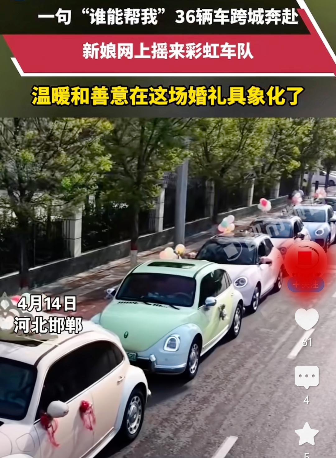 新娘一句求助,36辆彩虹车跨城奔赴!这才是人间温暖 一句“谁能帮我”,瞬间引来36辆彩虹车跨城奔赴,为素不相识的新娘撑起最浪漫的婚礼车队。没有血缘,不求回报,陌生人的善意最是动人。 愿这对新人带着全网的祝福,往后三餐四季,温暖相伴,日子红红火火,幸福长长久久。也愿这份温柔与善意,继续传递下去,照亮更多普通人。祝新婚快乐,一生被爱,所遇皆美好!