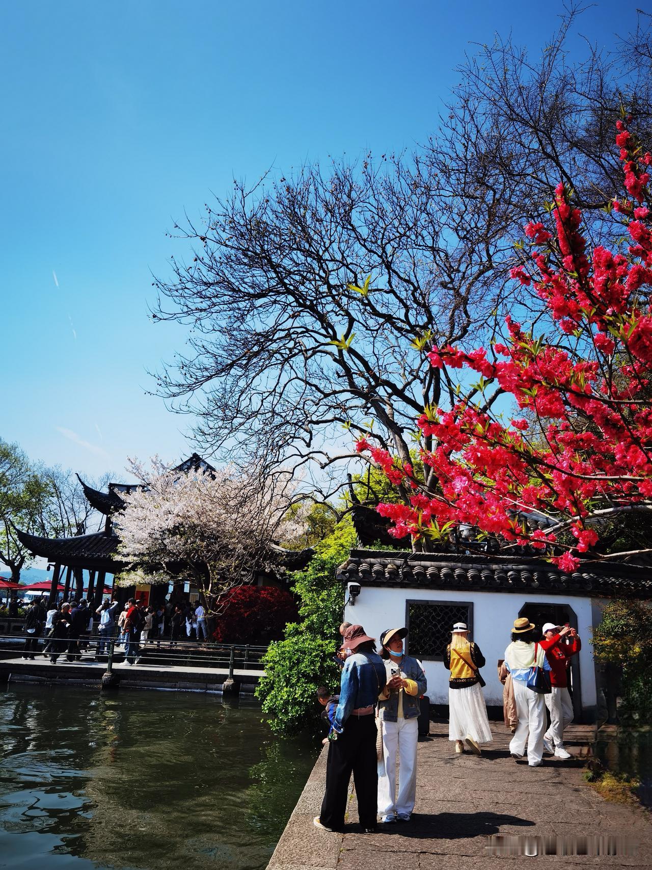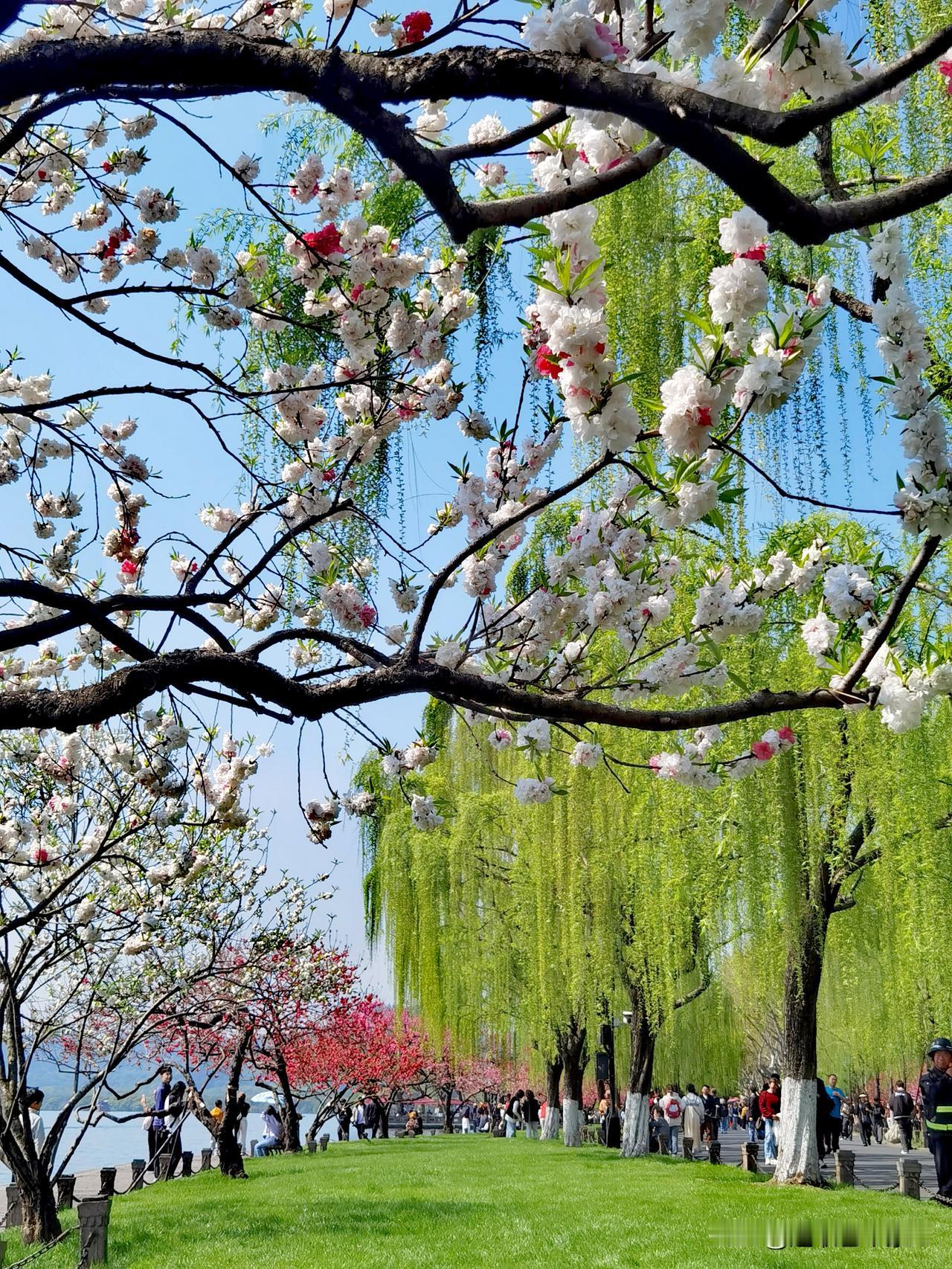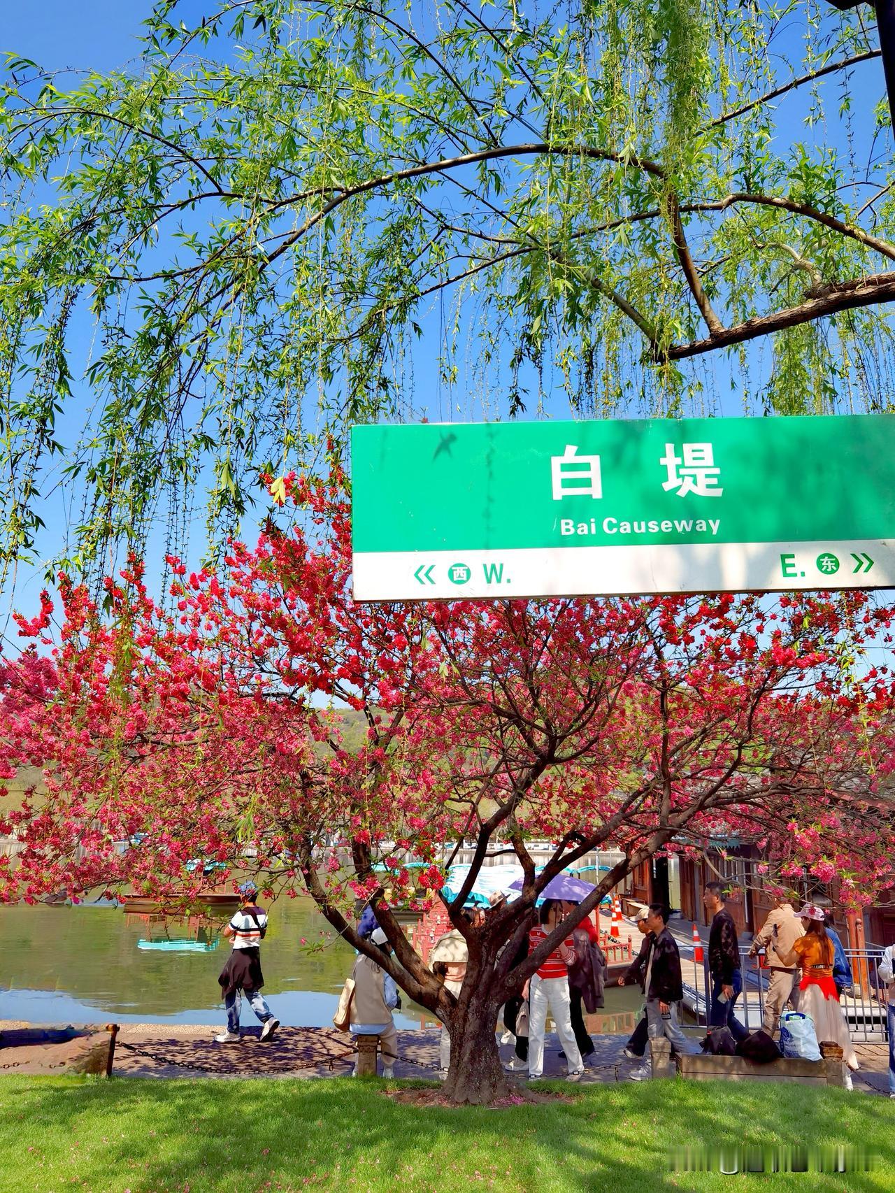 徒步杭州西湖北线景点,观景、赏花,‌白堤‌与‌苏堤‌是核心观赏区,呈现“桃红柳绿