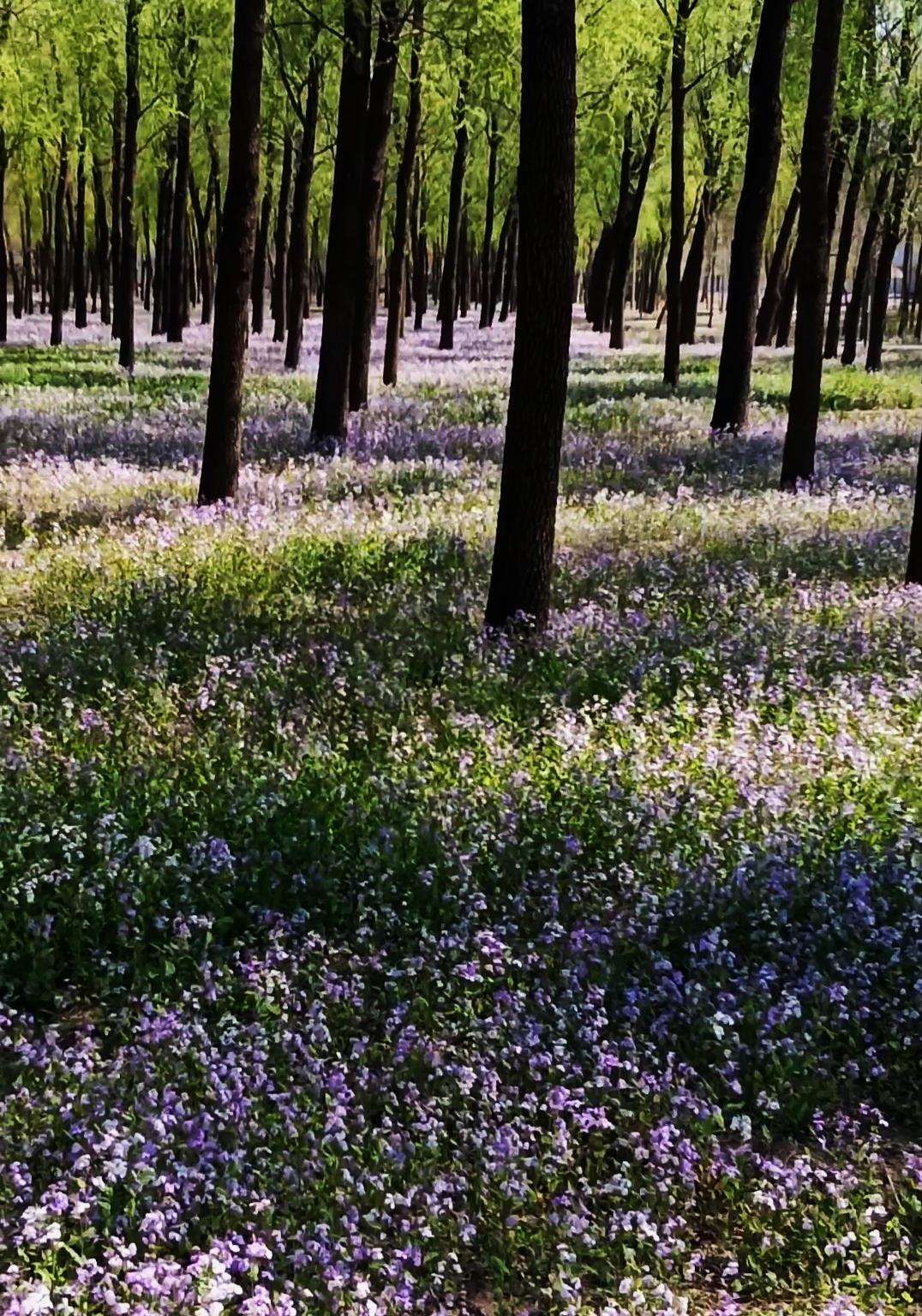 早饭后,儿子告诉我他今天要去办事,能顺便把我们带到将府公园,问我们去不去。这哪有不去的道理,美好景色我向来不会错过。 将府公园位于北京东坝,曾是明清时期“将府庄园”的旧址。从北4门进去没走多远,眼前的景色便让我惊呆了。高大茂密的树林中,步道蜿蜒曲折,树下的空地上,二月兰开得正茂盛,蓝紫色的花海将一切都淹没了。人们在花海中拍照、用低机位拍视频,仿佛在花海中悠然徜徉,趣味盎然。 我在树林周边游览拍照,许久都不愿离去,实在是太喜欢这里了。 继续往前走,黄色的连翘、粉色的桃花和李子花、梅红色的榆叶梅……各类花卉争奇斗艳,随处可见。 旁边有个野鸭湖,湖水清澈,红色的鱼儿在水中游弋。几只野鸭相互打闹、追逐嬉戏。 不知不觉就到了中午,因为是第一次来,也不清楚回去的路是否顺畅,不敢再往深处走了,于是收拾东西,打道回府。 将府公园人少景美,又不要门票,值得朋友们聚会,游览打卡。记着来时要从北4门进,北1门存车,门口有402路973路公交车,比较方便。