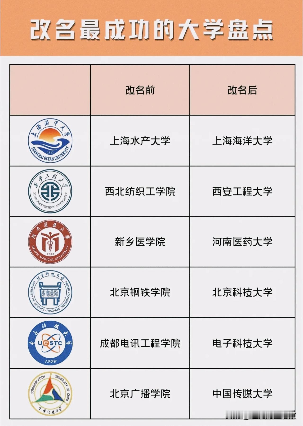 笑不活了!这些大学改名前后,简直是“土味逆袭”天花板! 🤣 第一波:从“土到掉渣”到“高端大气”,每一个都是神操作 - 青岛海洋大学 → 中国海洋大学 改名前:听着像青岛本地的水产技校! 改名后:国字头985!海洋界的扛把子!瞬间高大上! - 南京粮食学校 → 南京财经大学 改名前:听着像卖大米的中专! 改名后:财经类名校!谁能想到当年是管粮食的! - 杭州计量专科学校 → 中国计量大学 改名前:妥妥的专科小透明! 改名后:国字头本科!计量界唯一独苗!直接逆袭! - 泸州医学院 → 西南医科大学 改名前:四川泸州的地方医学院! 改名后:西南区域医学顶流!格局直接拉满! - 唐山铁道学院 → 西南交通大学 改名前:听着像唐山的铁路技校! 改名后:交通类名校!川渝学子的梦中情校! 🤣 第二波:从“行业专科”到“全国名校”,改名=换脸! - 北京钢铁学院 → 北京科技大学 改名前:听着像首钢的职工技校! 改名后:985名校!科技界的顶流!谁还记得当年是炼钢铁的! - 成都电讯工程学院 → 电子科技大学 改名前:听着像修电话的专科! 改名后:两电一邮!IT界黄埔军校!录取分数直接上天! - 北京广播学院 → 中国传媒大学 改名前:听着像北京电台的培训班! 改名后:传媒界天花板!主持人的摇篮! - 上海水产大学 → 上海海洋大学 改名前:听着像卖海鲜的技校! 改名后:上海海洋领域王牌!瞬间洋气! - 西北纺织工学院 → 西安工程大学 改名前:听着像纺织厂的职工学校! 改名后:西安综合类名校!摆脱土味标签! 💡 总结一下大学改名的“流量密码” ✅ 加“中国/国家”:直接从地方变全国,身价暴涨! ✅ 换赛道:从冷门行业(粮食、钢铁、纺织)换到热门(财经、科技、传媒)! ✅ 放大地域:从地级市→区域→全国,招生范围直接起飞! 这些大学用实力证明:改名不是玄学,是真的能逆袭! 你觉得哪所大学改名最离谱?你母校当年叫啥?评论区爆笑吐槽! 大学改名 高校逆袭 搞笑 高考志愿 中国传媒大学