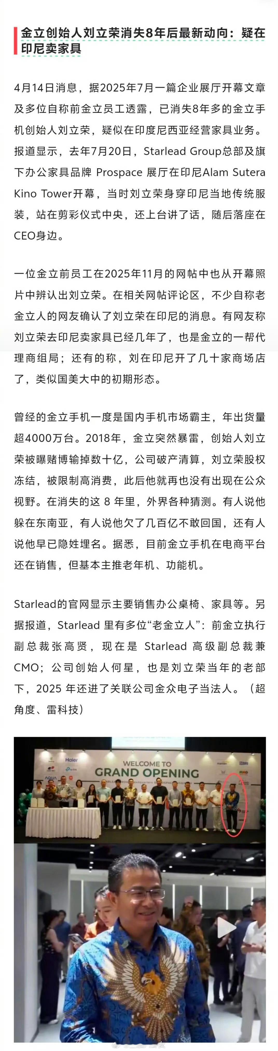 金立创始人被曝在印尼卖家具金立创始人刘立荣消失8年后最新动向:疑在印尼卖家具。印