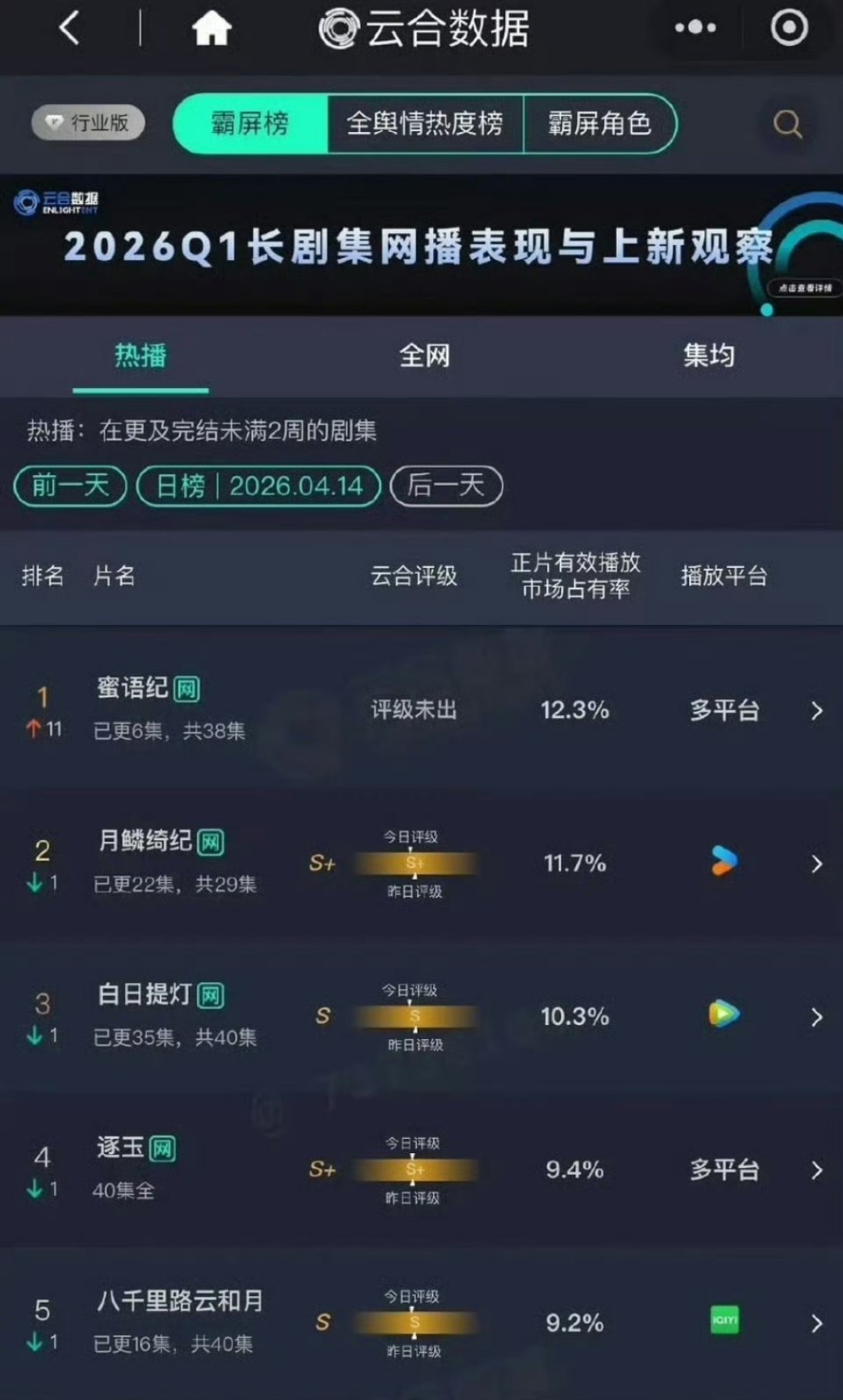 蜜语纪次日就把白日提灯按下去了,站内热度和播放量都压了