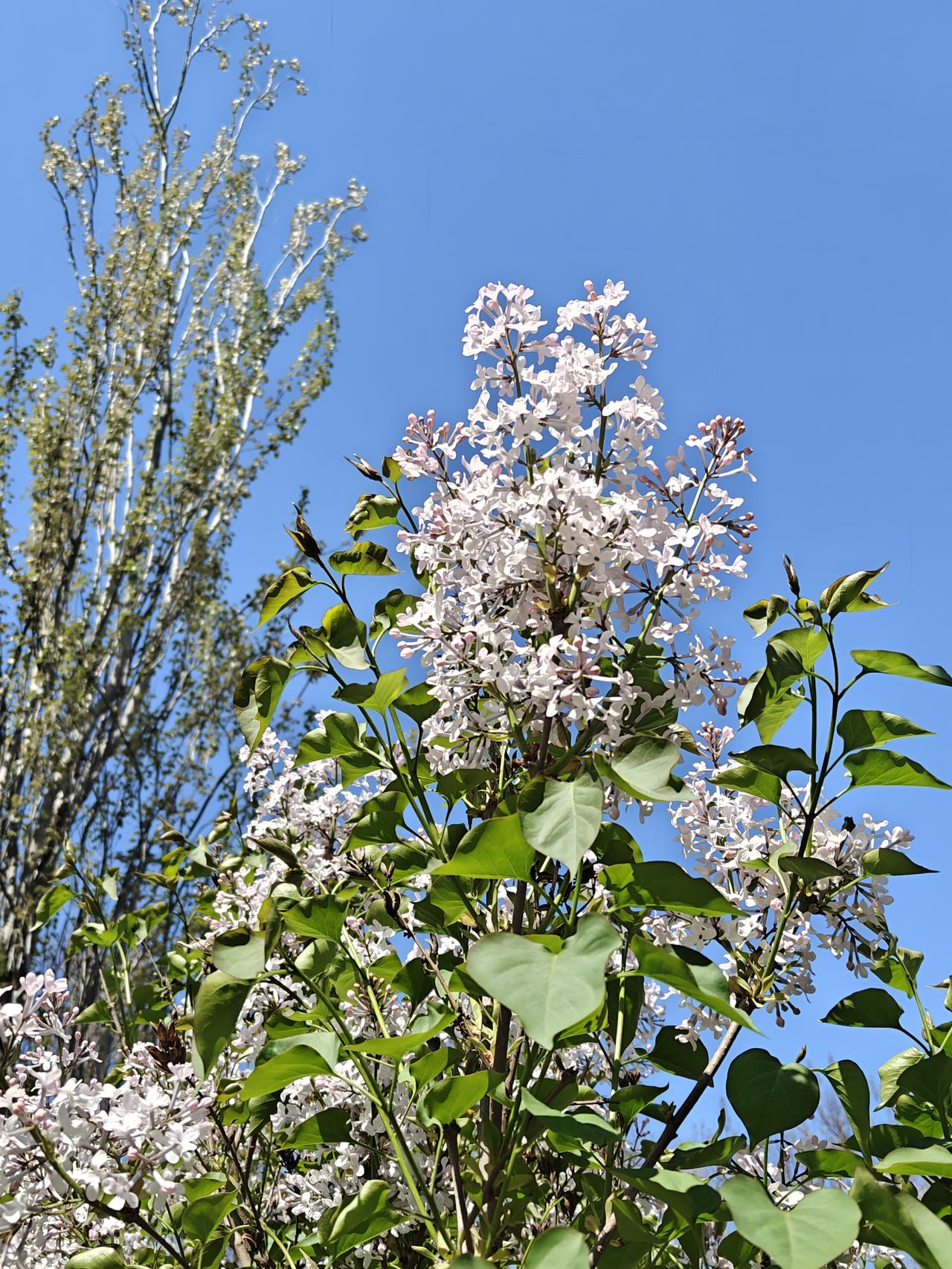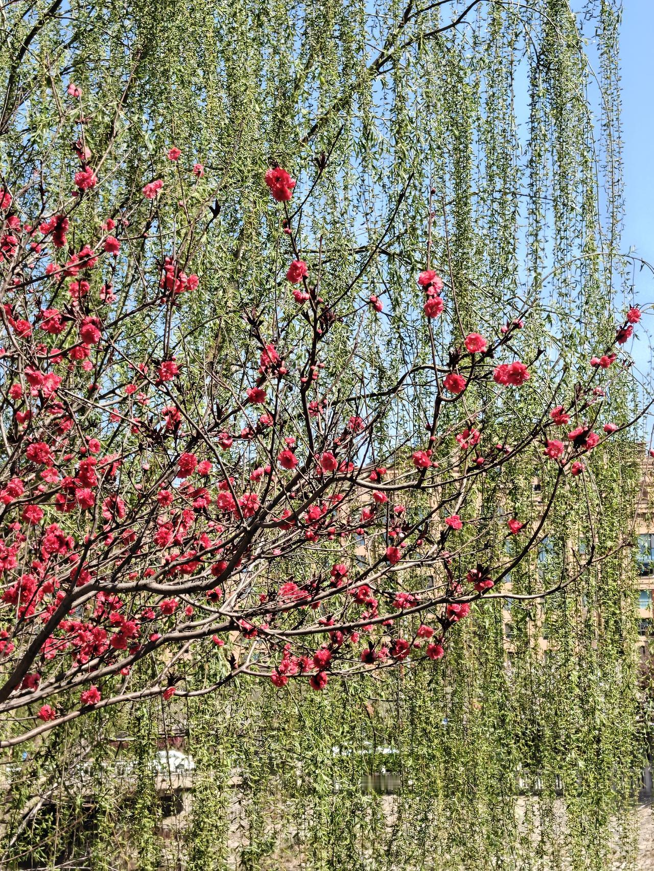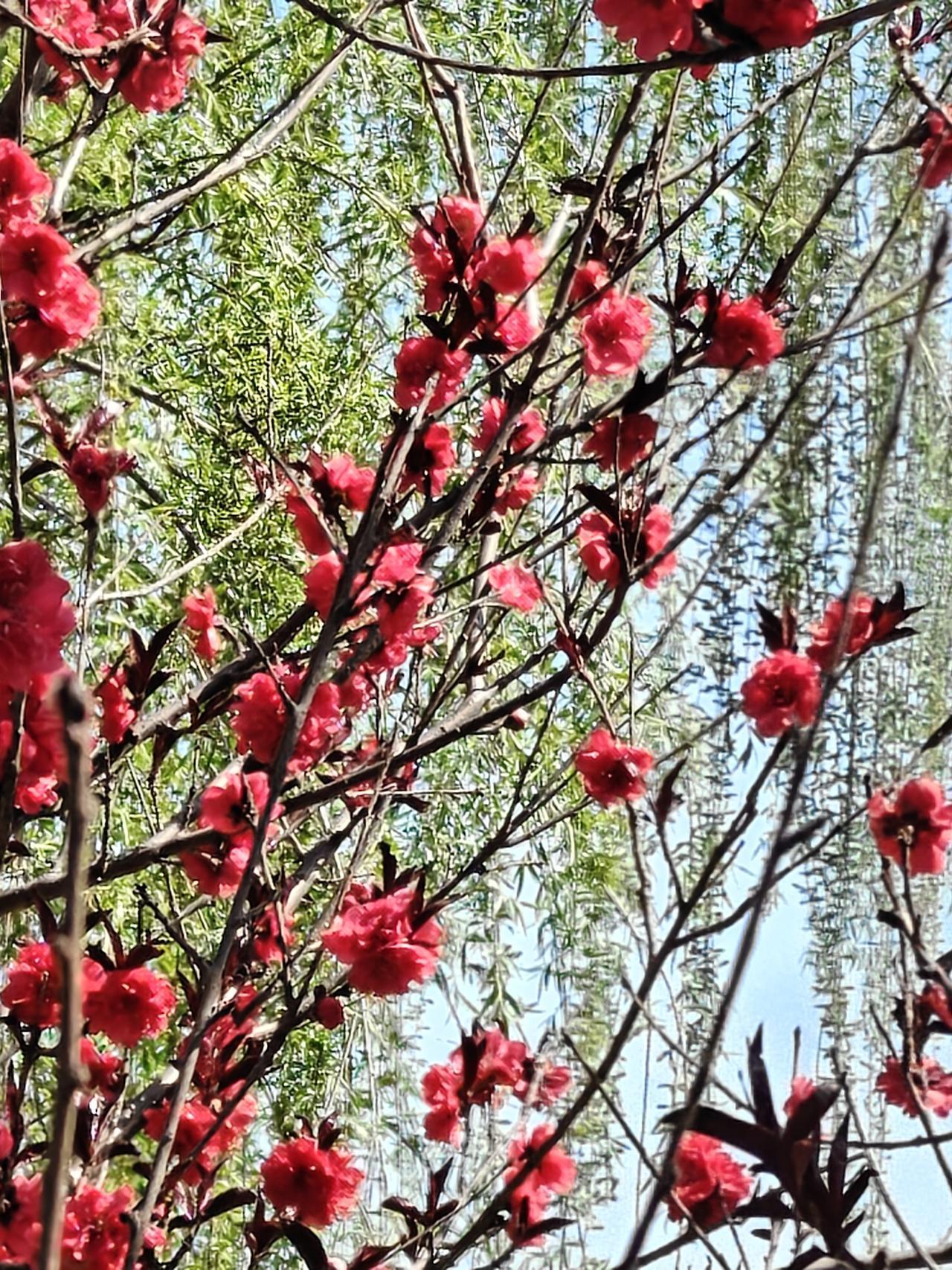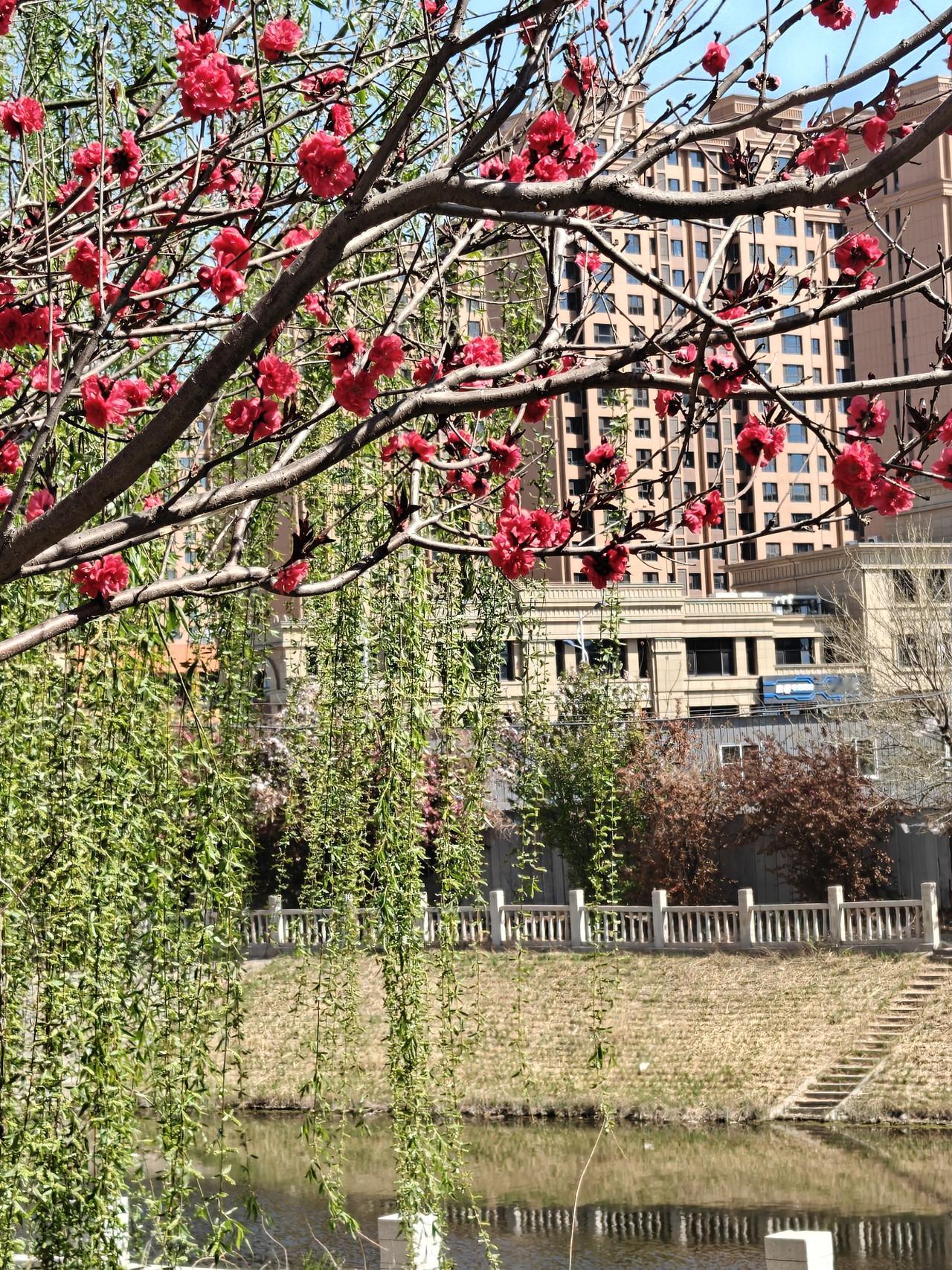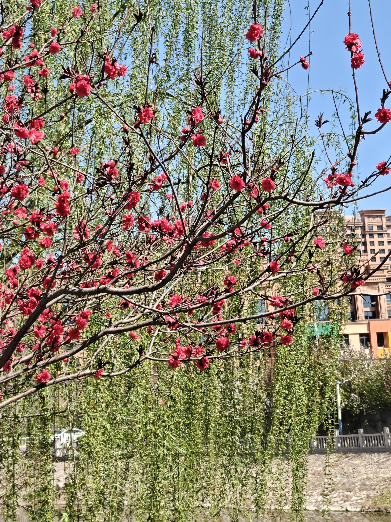 最美人间四月天,小河边的带状公园简直美炸了!海棠、碧桃、丁香都盛开啦。 海棠花艳丽,西府海棠白中略带粉色,那么娇美,北美海棠像是少女羞红的脸;有一株树两种海棠竟长在了一起,交相辉映。碧桃的花朵富丽堂皇红得正艳,微风拂过,花瓣轻摇,宛如少女舞动的裙摆;她正和旁边的柳枝共舞,绿柳红花相映成趣。丁香被誉为“春日香氛使者”,那沁人心脾的甜香弥漫在空气中,白丁香和紫丁香频频点头,在春风中争着送来缕缕花香。河岸的垂绿,柳枝犹如绿丝带,在风中婀娜多姿。 这小河边的带状公园,,漫步其中,仿佛置身于五彩斑斓的画卷里。