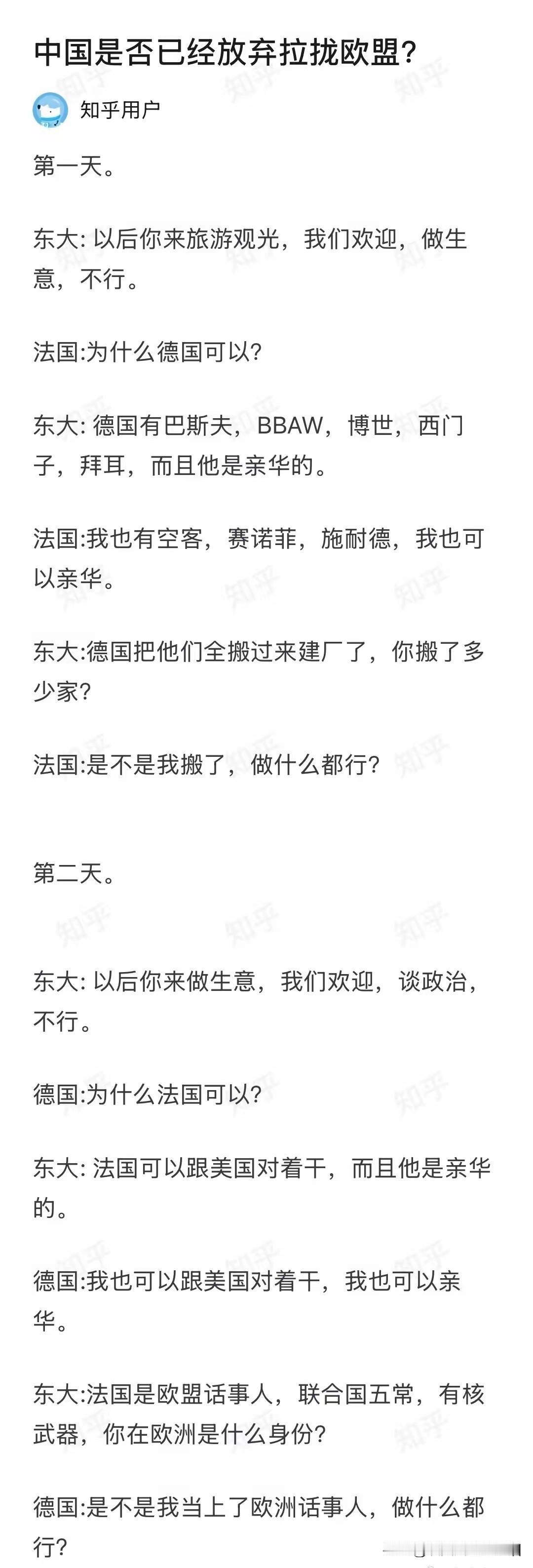 欧盟内部并非一团和谐! 最经典的就是新能源车,德国因为在国内有重大利益,支持国内新能源车进欧洲。法国却因为新能源车没有方向,选择拒绝。但是最终各种谈判拉扯,国内新能源车顺利进入欧洲销售。 法国不愿意配合,那就多定点空客飞机,没有什么解决不了。如果一架空客不够,那就定两架。实在不行就几百架,够了吧? 不管咋说,德国和法国是欧洲领导者,虽然面子上一团和谐,实际上缠斗几百年了。普法战争都知道,最后一课也知道吧? 一战和二战不就是德法大战?一战法国顶住了,二战直接一泻千里。法国如今持续被各种揶揄,不就是二战投降太快了嘛? 法国可以爱大国,德国就不可以爱大国?这就叫谈判的艺术。英国退出欧盟,反而容易拿捏了。德法就需要下点不同筹码,分而击之,然后迅速赢得谈判主动权。 讲白一点,欧洲一团和气,那是目前各方都有利益可拿。一旦经济不行了,那还能一团和气吗?一战和二战就是利益分配不均起来的。 一旦欧盟内部开始各顾各的,那就散盟不远了。当然老美更希望欧盟散了,足可以掌控欧盟。天下大势,分分合合,欧盟因为利益结合,也可以利益分开。 老美都想退了北约,以前敢想吗?