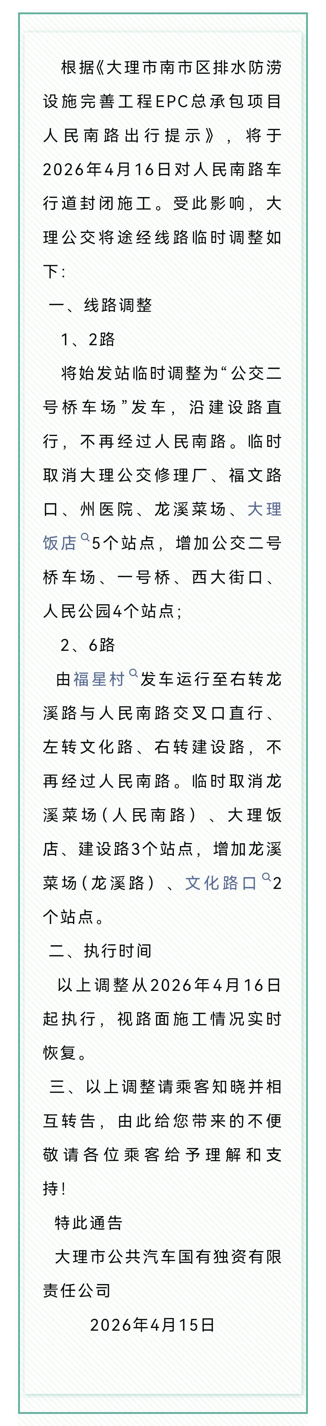 大理公交关于人民南路施工实施交通管制期间部分线路临时调整的通告 根据《大理市南市区排水防涝设施完善工程EPC总承包项目人民南路出行提示》,将于2026年4月16日对人民南路车行道封闭施工。受此影响,大理公交将途经线路临时调整如下: 一、线路调整 1、2路 将始发站临时调整为“公交二号桥车场”发车,沿建设路直行,不再经过人民南路。临时取消大理公交修理厂、福文路口、州医院、龙溪菜场、大理饭店5个站点,增加公交二号桥车场、一号桥、西大街口、人民公园4个站点; 2、6路 由福星村发车运行至右转龙溪路与人民南路交叉口直行、左转文化路、右转建设路,不再经过人民南路。临时取消龙溪菜场(人民南路)、大理饭店、建设路3个站点,增加龙溪菜场(龙溪路)、文化路口2个站点。 二、执行时间 以上调整从2026年4月16日起执行,视路面施工情况实时恢复。 三、以上调整请乘客知晓并相互转告,由此给您带来的不便敬请各位乘客给予理解和支持! 特此通告 大理市公共汽车国有独资有限责任公司 2026年4月15日