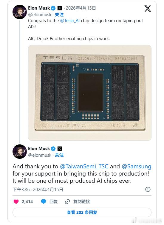 特斯拉最新一代AI5芯片成功流片