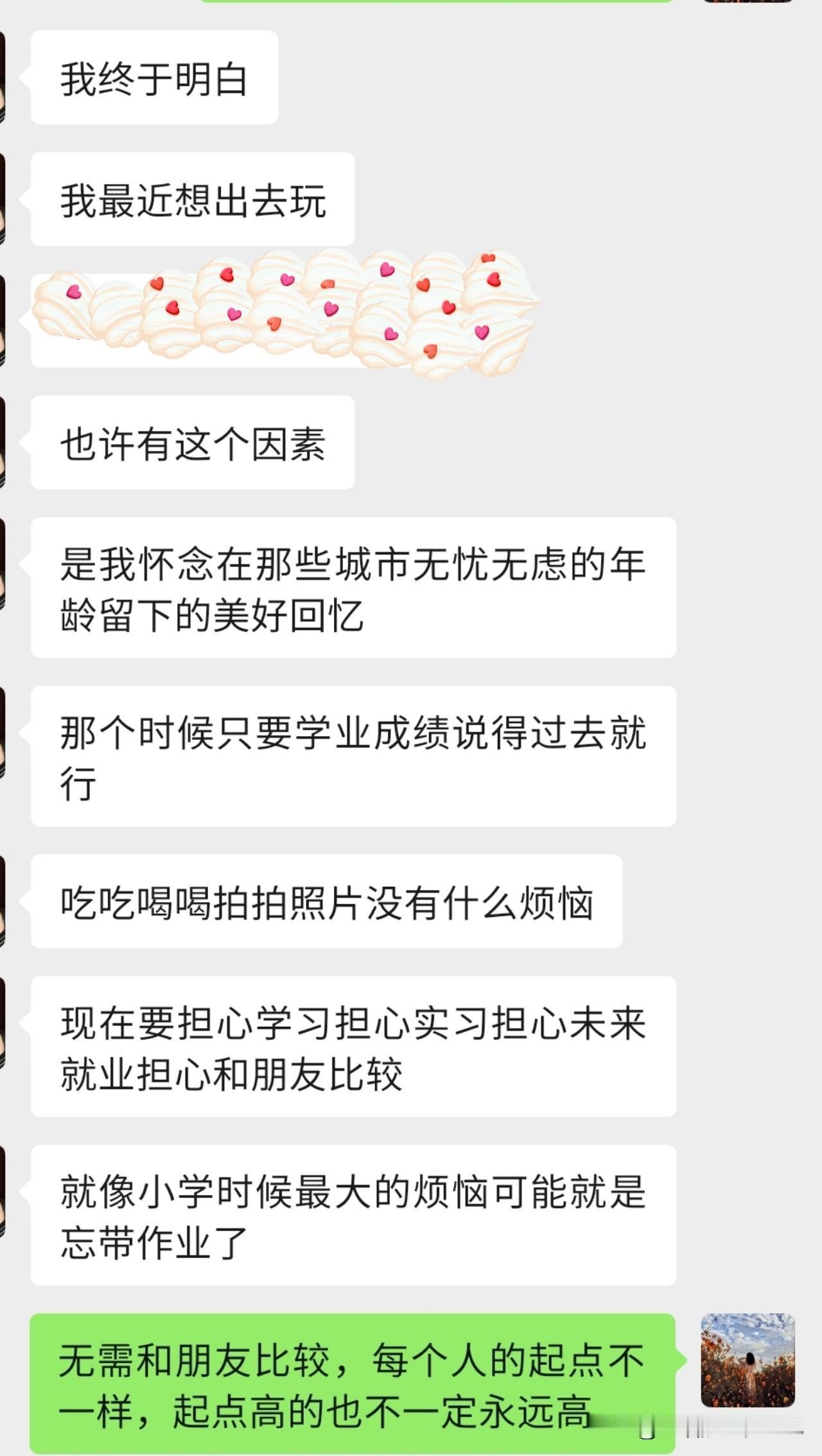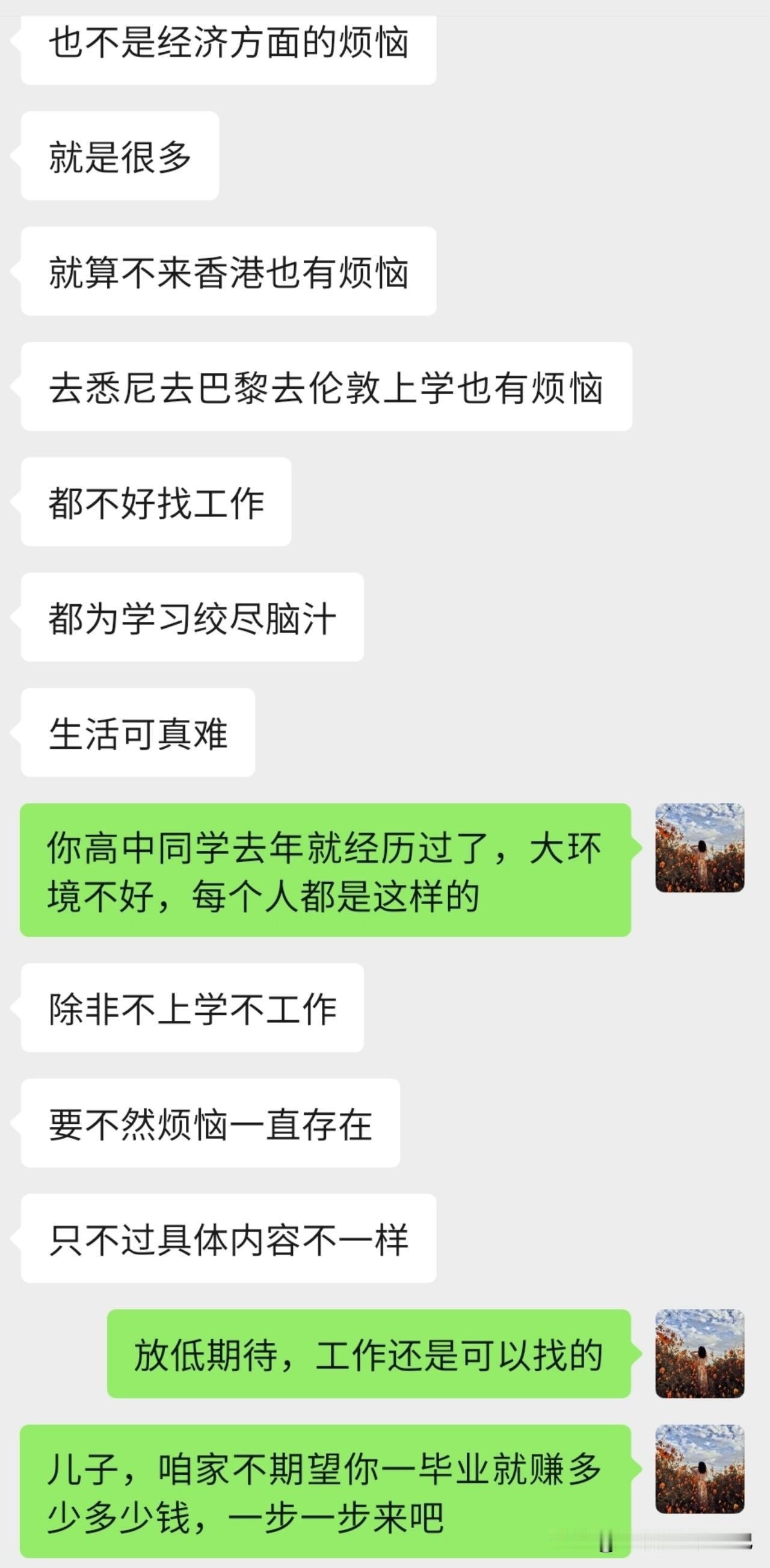 儿子虽然还有一年多毕业,但是他如今已经感受到就业之难,对未来有迷茫有焦虑。 我这个妈妈看到他这样,心疼焦急可又没什么办法。 以前对于他来说,可以说是无忧无虑,当初看他中考、高考、志愿填报、申研、赴港留学,每一步都像奥特曼升级打怪兽,闯过一座山,又面对一座山。 可如今再回首看,似乎曾经的艰难都不算难。成长是一场剧痛。当一个人长大了,懂事了,他才有了责任感,有了更多放不下的牵挂。 特别是面对大环境不好,未来就业形势,儿子充满了迷茫。 我这个心灵辅导师妈妈,需要重新上岗。我需要做的,就是给他鼓励,给他信心。给他一个稳定大后方。 昨天下午,他和同学去咖啡厅复习备考,他给我发过来一大段一大段留言。
