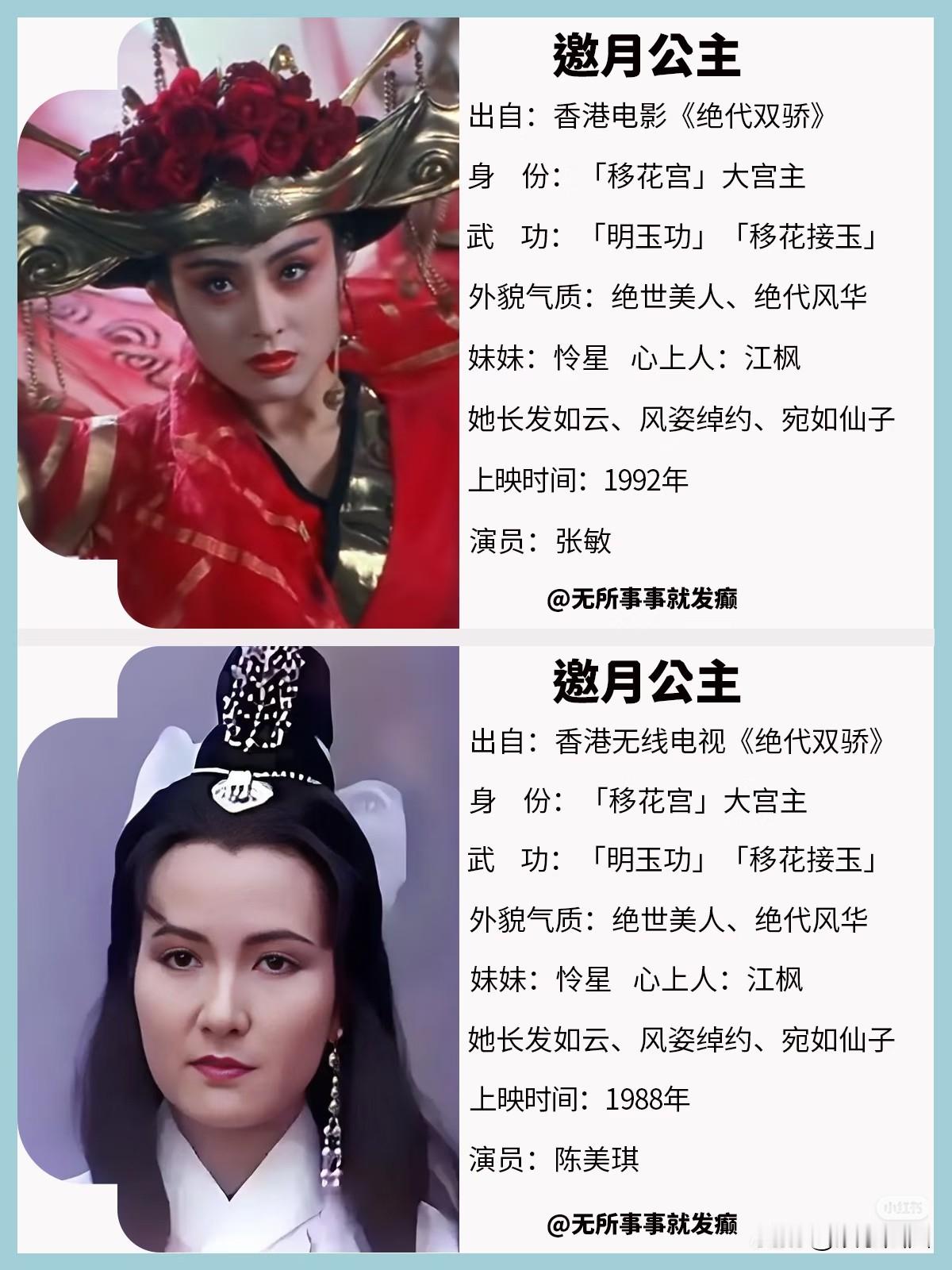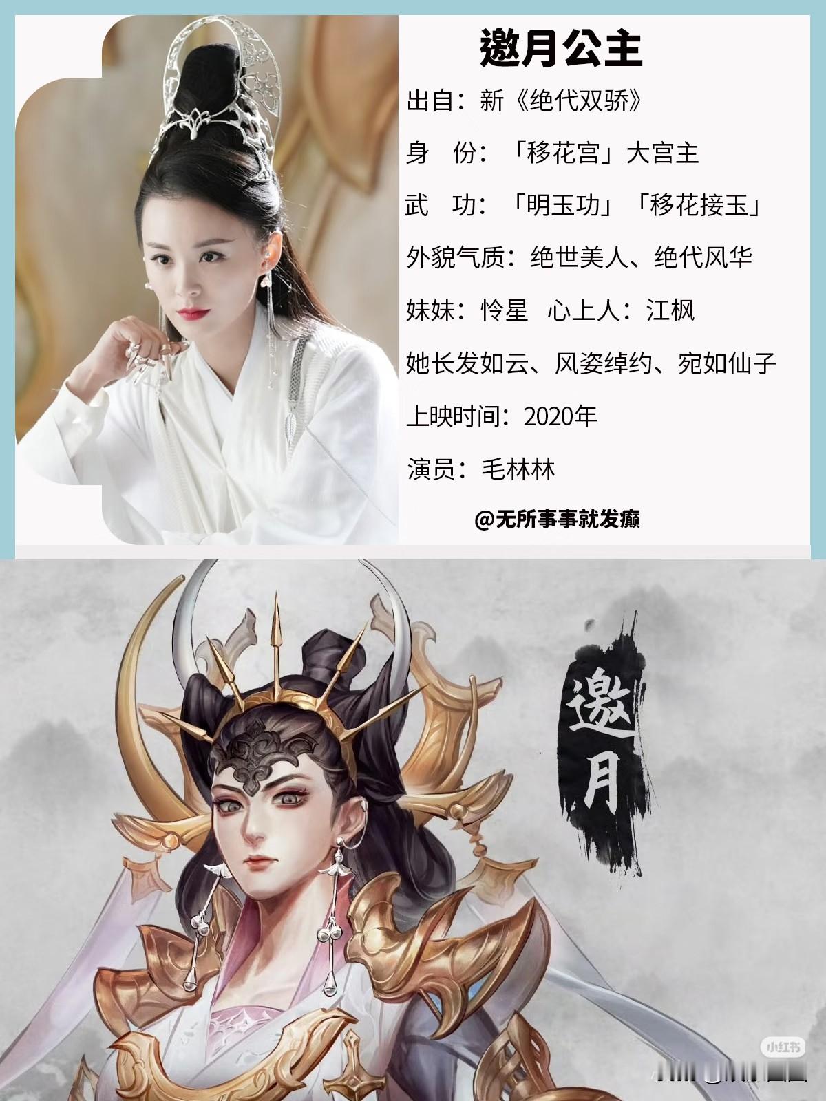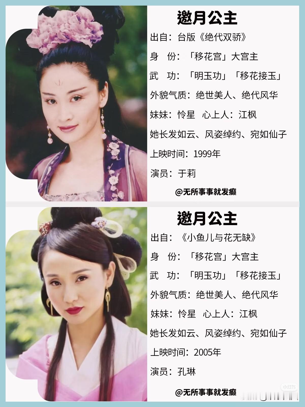 邀月公主出自古龙经典小说《绝代双骄》,她风华绝代、气质出众,仿佛从书中走出的仙女。不同版本的邀月公主各具风采,令人耳目一新。让我们一起来回顾这7位角色,看看谁最戳中你的内心?