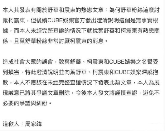 造谣叶舒华恋情者道歉 造谣叶舒华恋情者已道歉.......